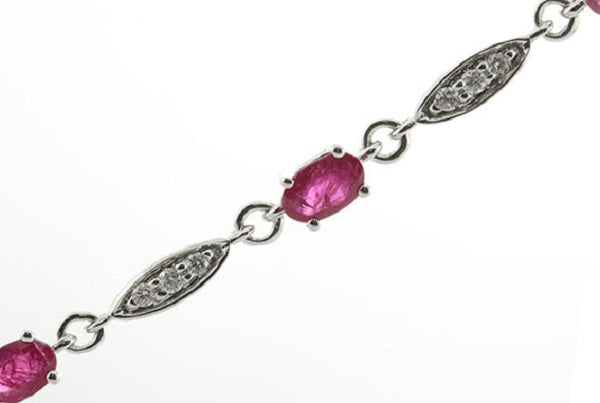 Stunning, timeless and classy eternity Unique ring. Decorate yourself in luxury with this Gin & Grace Bracelet. This Bracelet is made up of Oval-Cut Prong Setting Genuine Mozambique Ruby (9 pcs) 2.53 Carat and Round-Cut Prong Setting Natural Diamond (27 pcs) 0.27 Carat accent stones for a lovely design. This bracelet is weight 4.34 grams. The Bracelet is crafted of shining 10-karat White Gold and is completed by a highly polished finish.