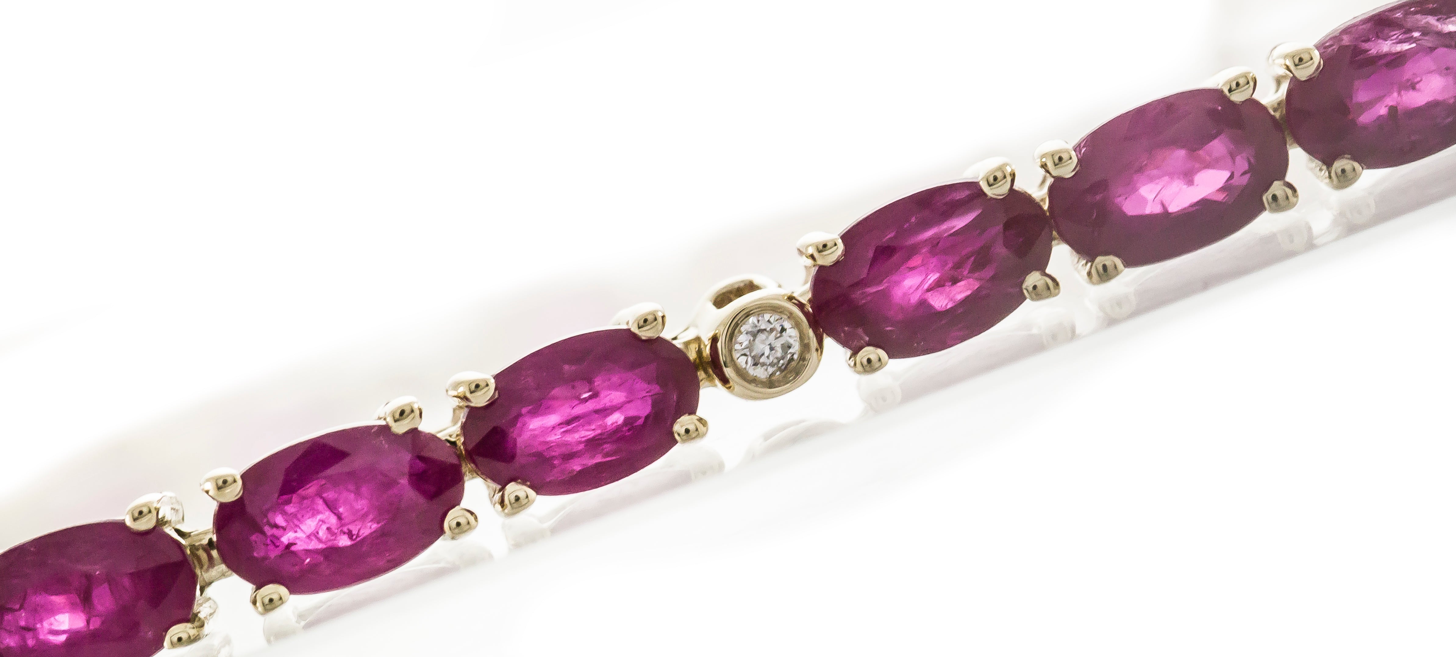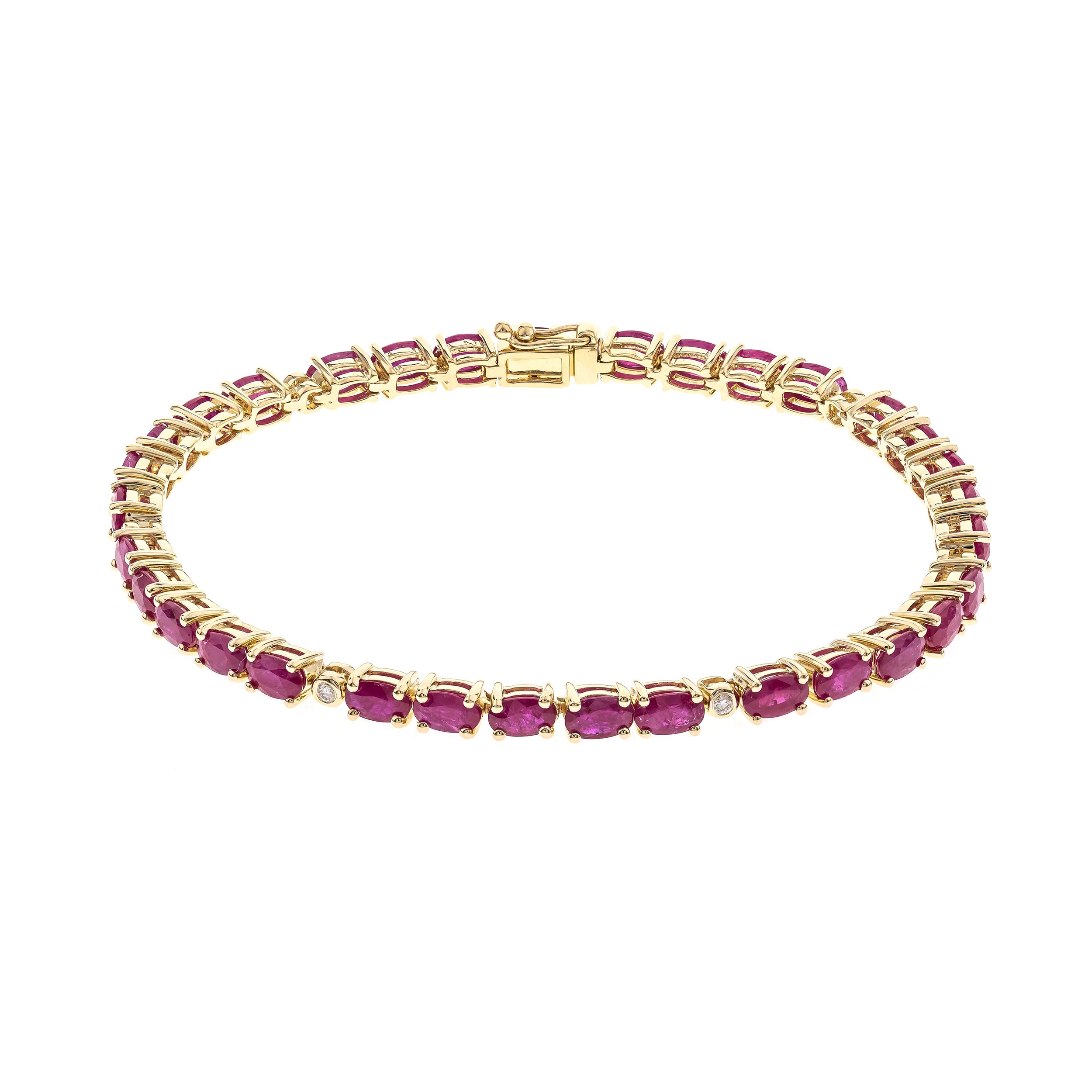 Stunning, timeless and classy eternity Unique Bracelet. Decorate yourself in luxury with this Gin & Grace Bracelet. The 10K Yellow Gold jewelry boasts Oval-Cut Prong Setting Natural Mozambique Ruby (33 pc) 10.75 Carat, along with Natural Round cut white Diamond (7 Pcs) 0.07 Carat, accent stones for a lovely design. This Bracelet is weight 6.96 grams. Crafted with 10K Yellow Gold, this delicate Bracelet is polished to a high finish shine.