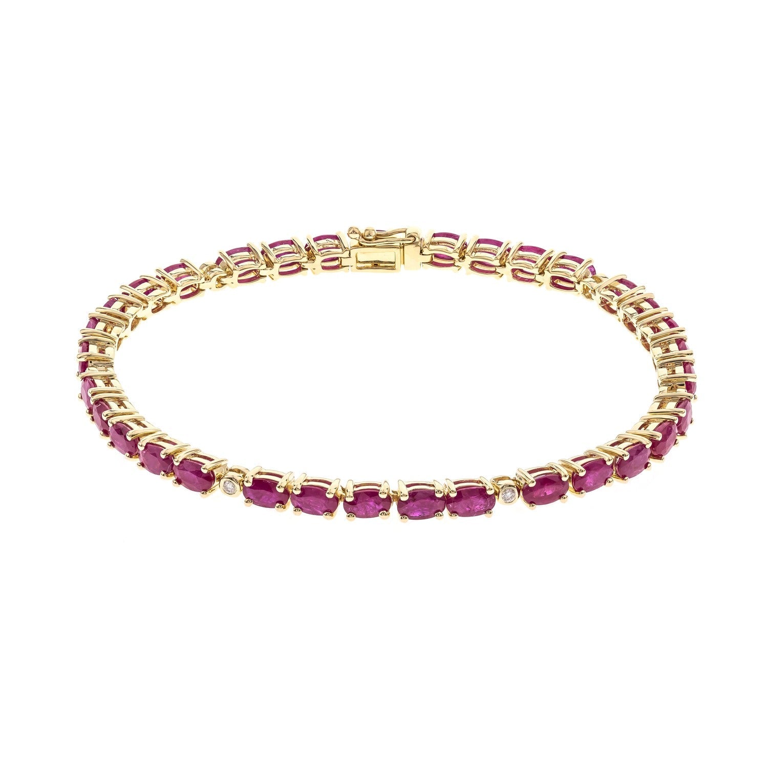 Stunning, timeless and classy eternity Unique Bracelet. Decorate yourself in luxury with this Gin & Grace Bracelet. The 10K Yellow Gold jewelry boasts Oval-Cut Prong Setting Natural Mozambique Ruby (33 pc) 10.75 Carat, along with Natural Round cut white Diamond (7 Pcs) 0.07 Carat, accent stones for a lovely design. This Bracelet is weight 6.96 grams. Crafted with 10K Yellow Gold, this delicate Bracelet is polished to a high finish shine.