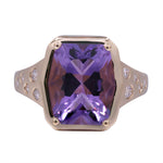 This ring is a captivating piece that showcases the rich beauty of a 5.51 ct Fancy Cushion-cut natural amethyst at its center. Its deep violet hue is elegantly complemented by 0.22 ct of sparkling round diamonds delicately set into the gold band, adding a subtle shimmer that enhances the gemstone’s brilliance. Weighing 4.08 grams, this ring blends bold color with refined sparkle, creating a timeless design that is both graceful and distinctive. 💜