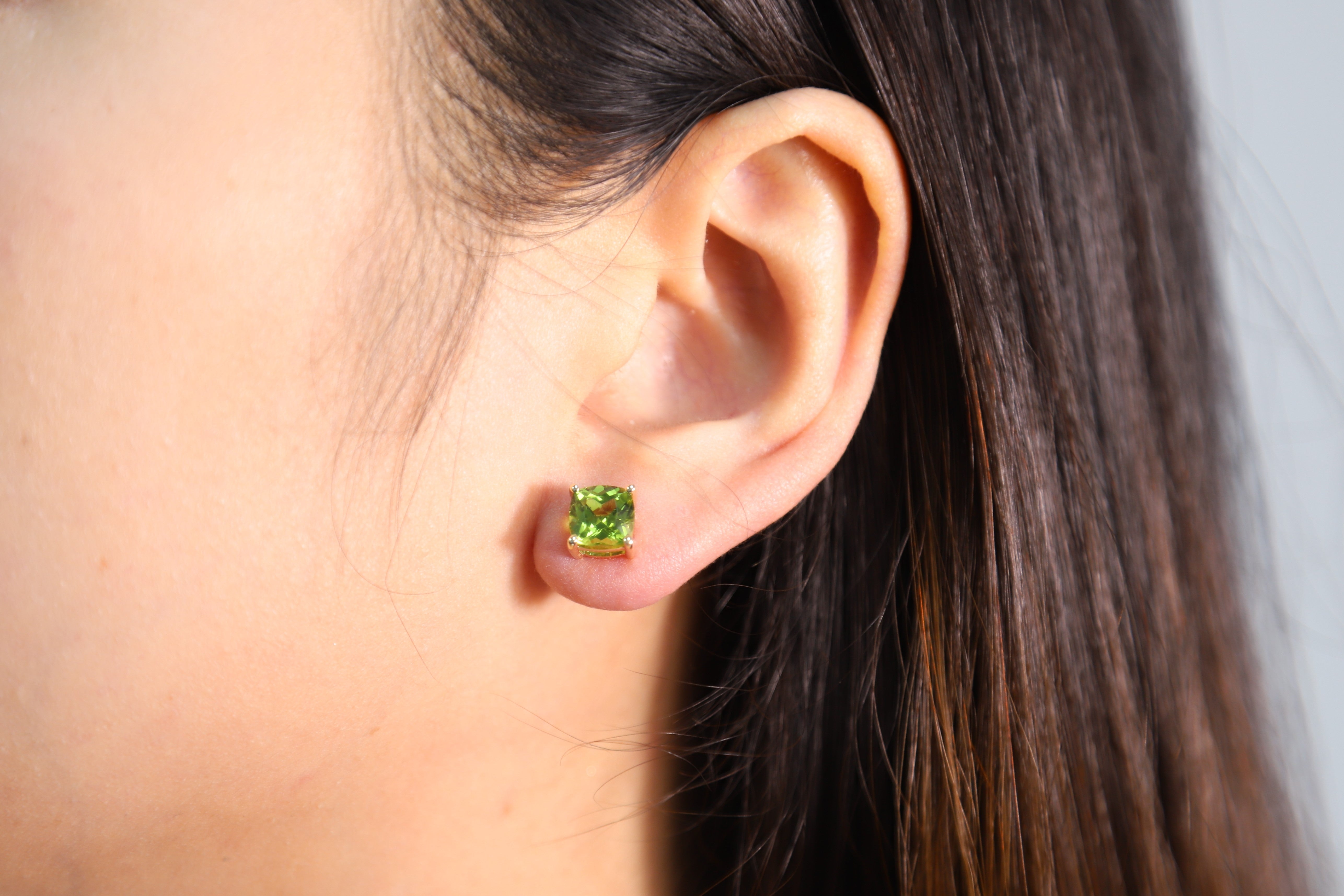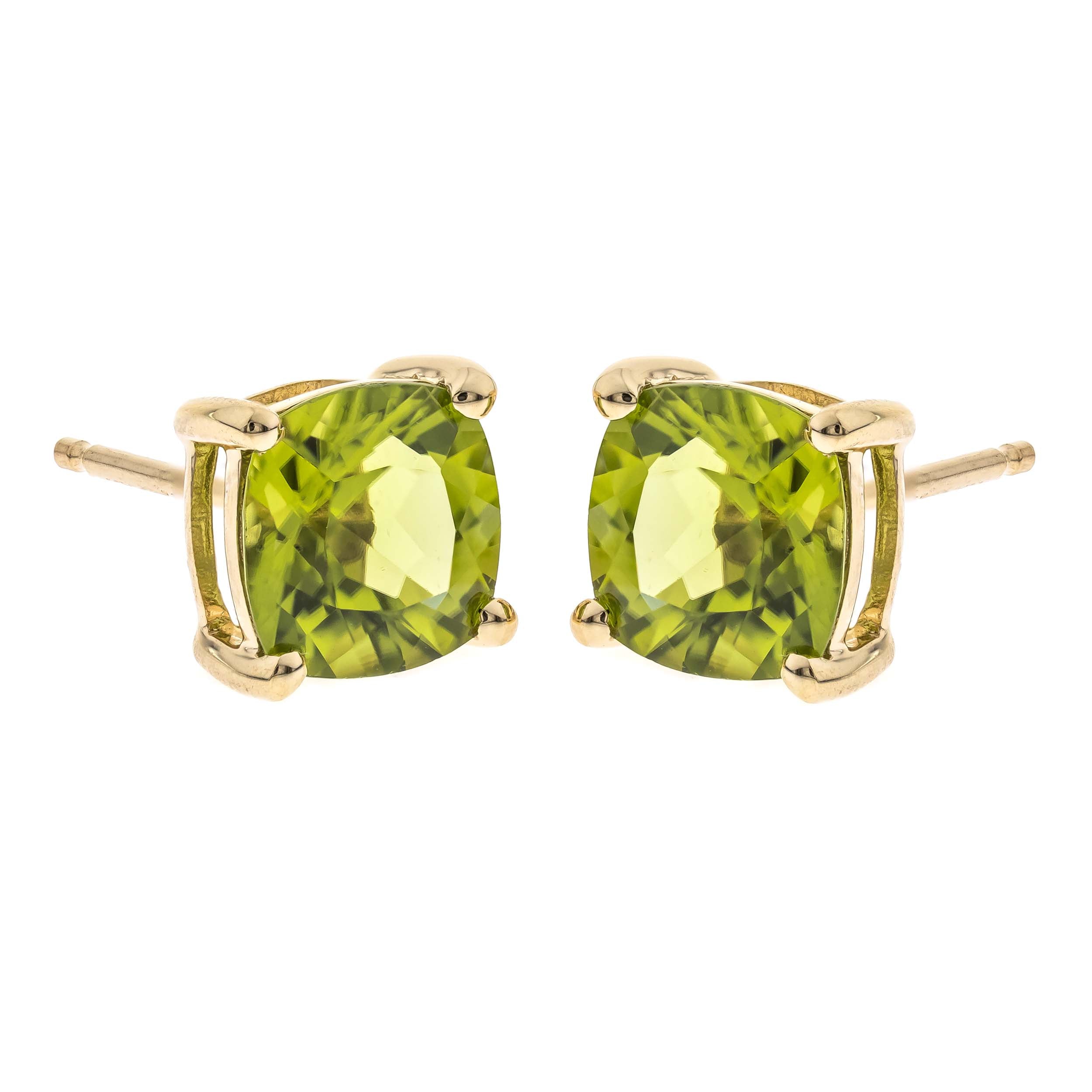 Decorate yourself in elegance with this Earring is crafted from 14-karat Yellow Gold by Gin & Grace. This Earring is made up of 7.0mm Cushion-Cut Manchurian Peridot (2 Pcs) 3.32 carat. This Earring is weight 1.97 grams. This delicate Earring is polished to a high finish shine.