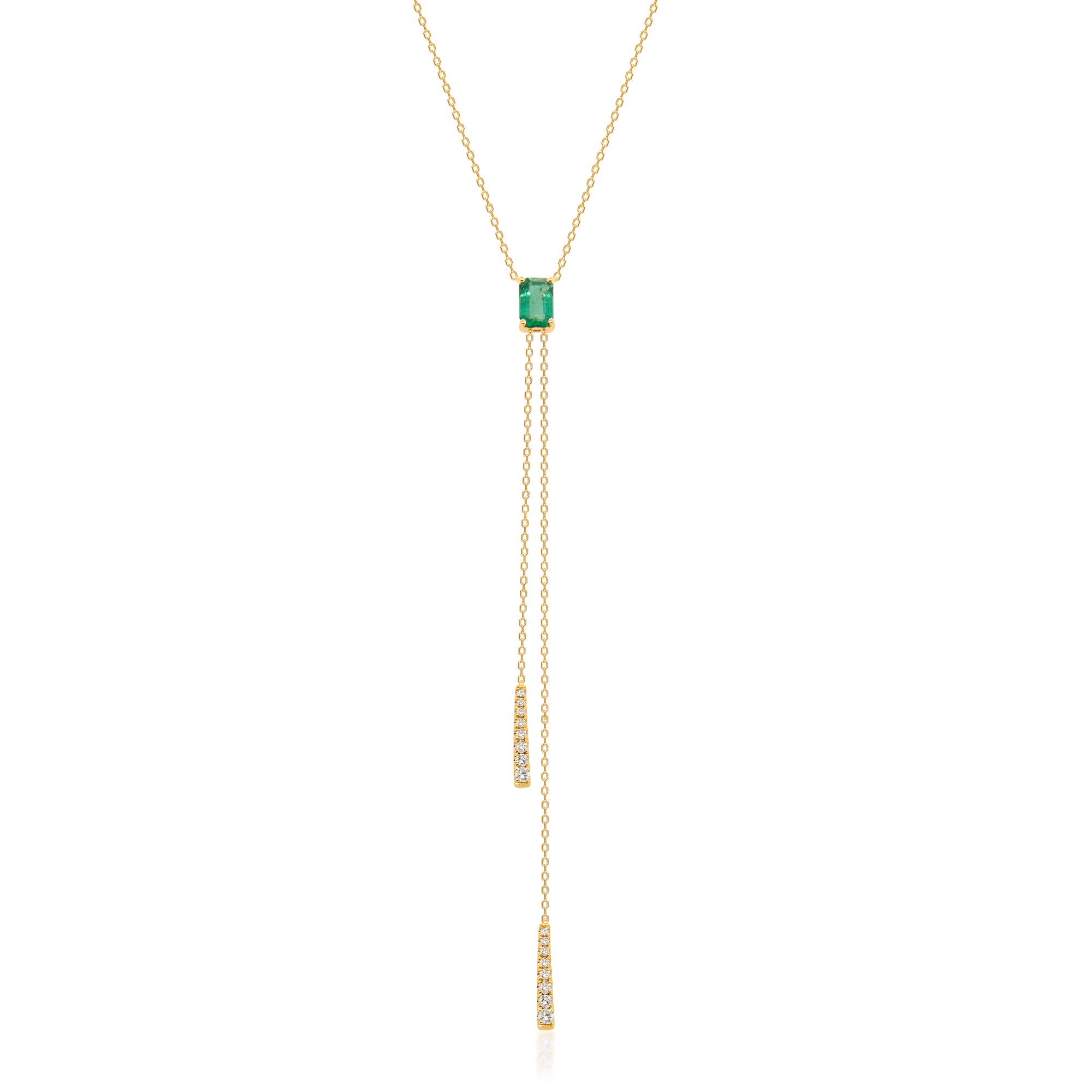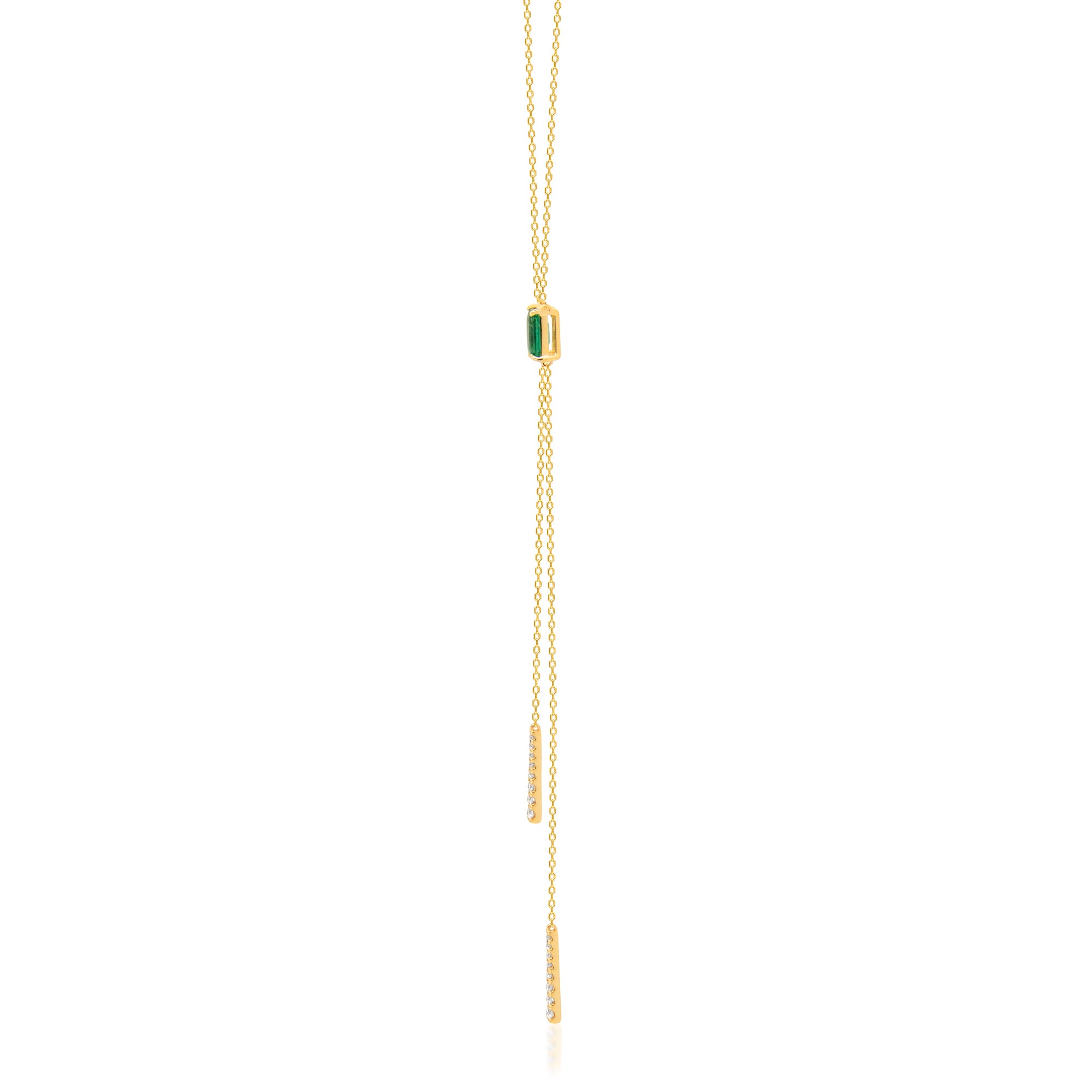 Decorate yourself in elegance with this Necklace is crafted from 14-karat yellow Gold by Gin & Grace. This Necklace is made up of 4*6 mm Zambian Emerald emerald-cut (1 pcs) 0.57 carat and Round-cut Diamond (20 Pcs) 0.19 carat. This Necklace is weight 2.74 grams. This delicate Necklace is polished to a high finish shine.