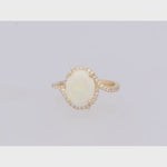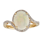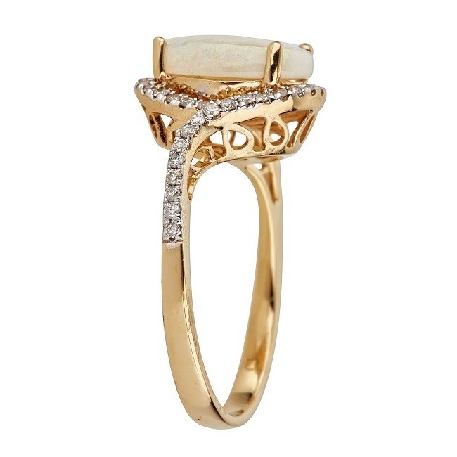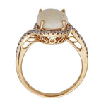 Decorate yourself in elegance with this Ring is crafted from 14-karat Yellow Gold by Gin & Grace. This Ring is made up of 6*8 mm Oval-cut (1 pcs) 2.00 carat African Opal and Round Cut Diamond (46 Pcs) 0.22 Carat . This Ring is weight 3.44 grams. This delicate Ring is polished to a high finish shine.