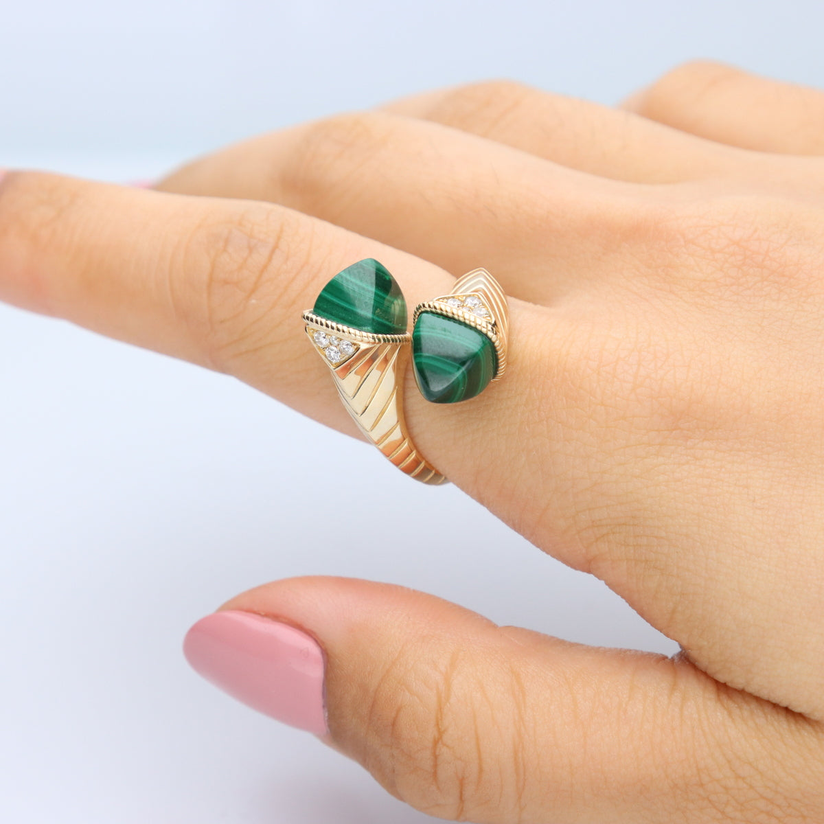 Decorate yourself in elegance with this Ring is crafted from 14K Yellow Gold by Gin & Grace. This Ring is made up of Fancy-Cut Malachite (2 Pcs) 8.59 and White Diamond (8 Pcs) 0.12 carat. This Ring is weight 6.67 grams. This delicate Ring is polished to a high finish shine.