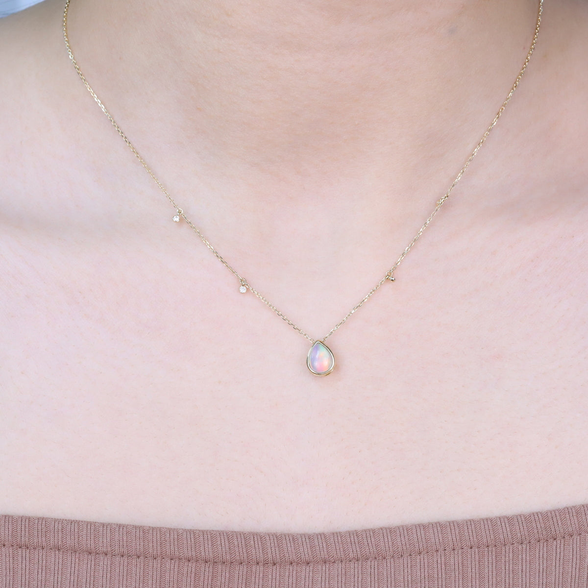 Decorate yourself in elegance with this Necklace is crafted from 10-karat Yellow Gold by Gin & Grace. This Necklace is made up of 6*8 mm African Opal Pear-cut (1 pcs) 0.71 and Round-cut White Diamond (4 Pcs) 0.05 carat. This Necklace is weight 1.96 grams. This delicate Necklace is polished to a high finish shine.
