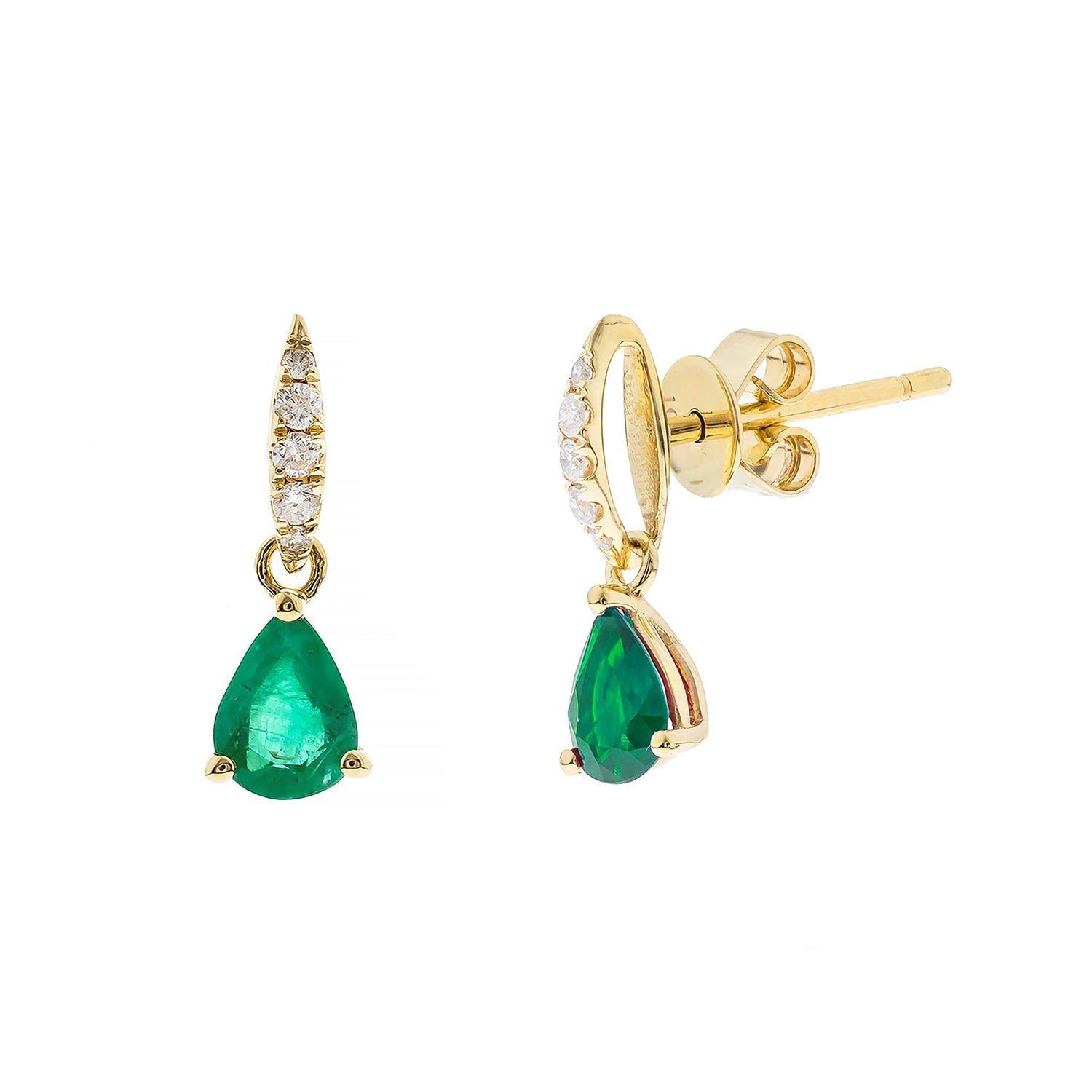 Decorate yourself in elegance with this Earring is crafted from 14-karat Yellow Gold by Gin & Grace. This Earring is made up of Zambian Emerald 4*5 mm Pear-cut (2 pcs) 0.54 carat and Round-cut White Diamond (10 Pcs) 0.06 Carat. This Earring is weight 0.88 grams. This delicate Earring is polished to a high finish shine.