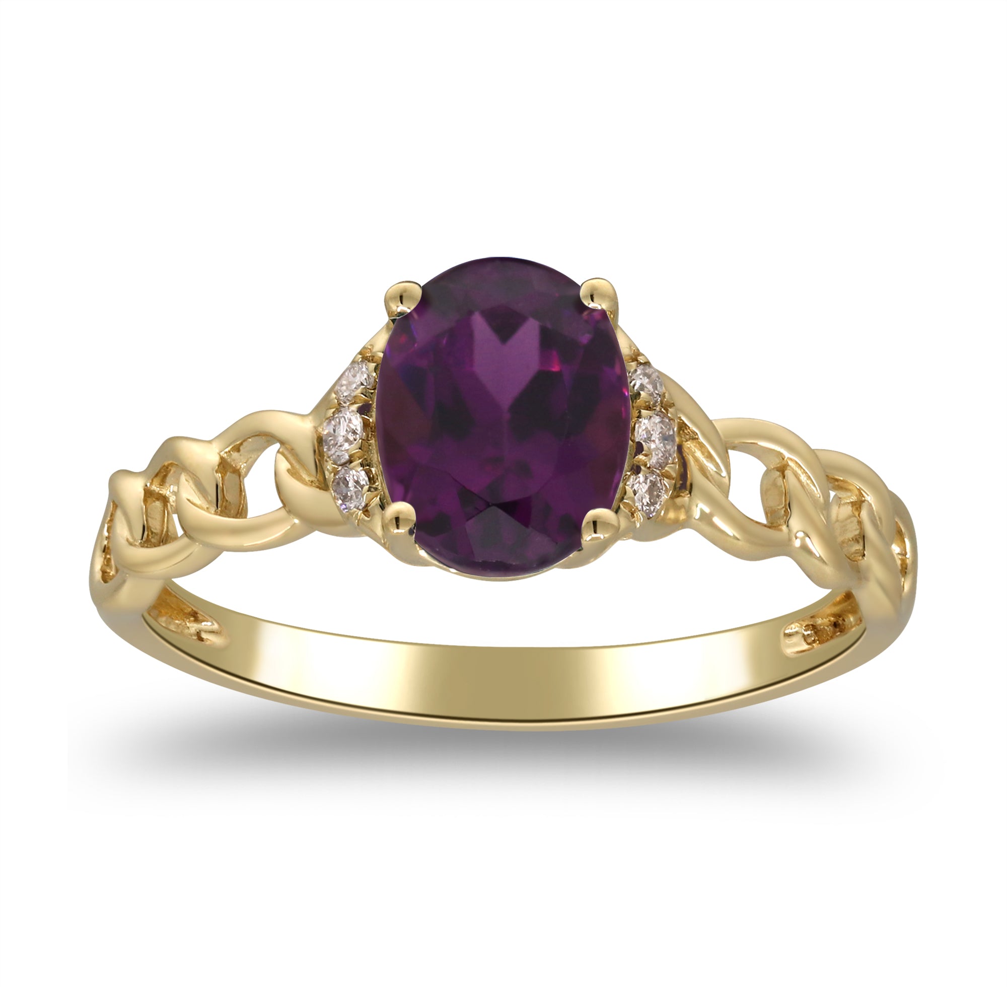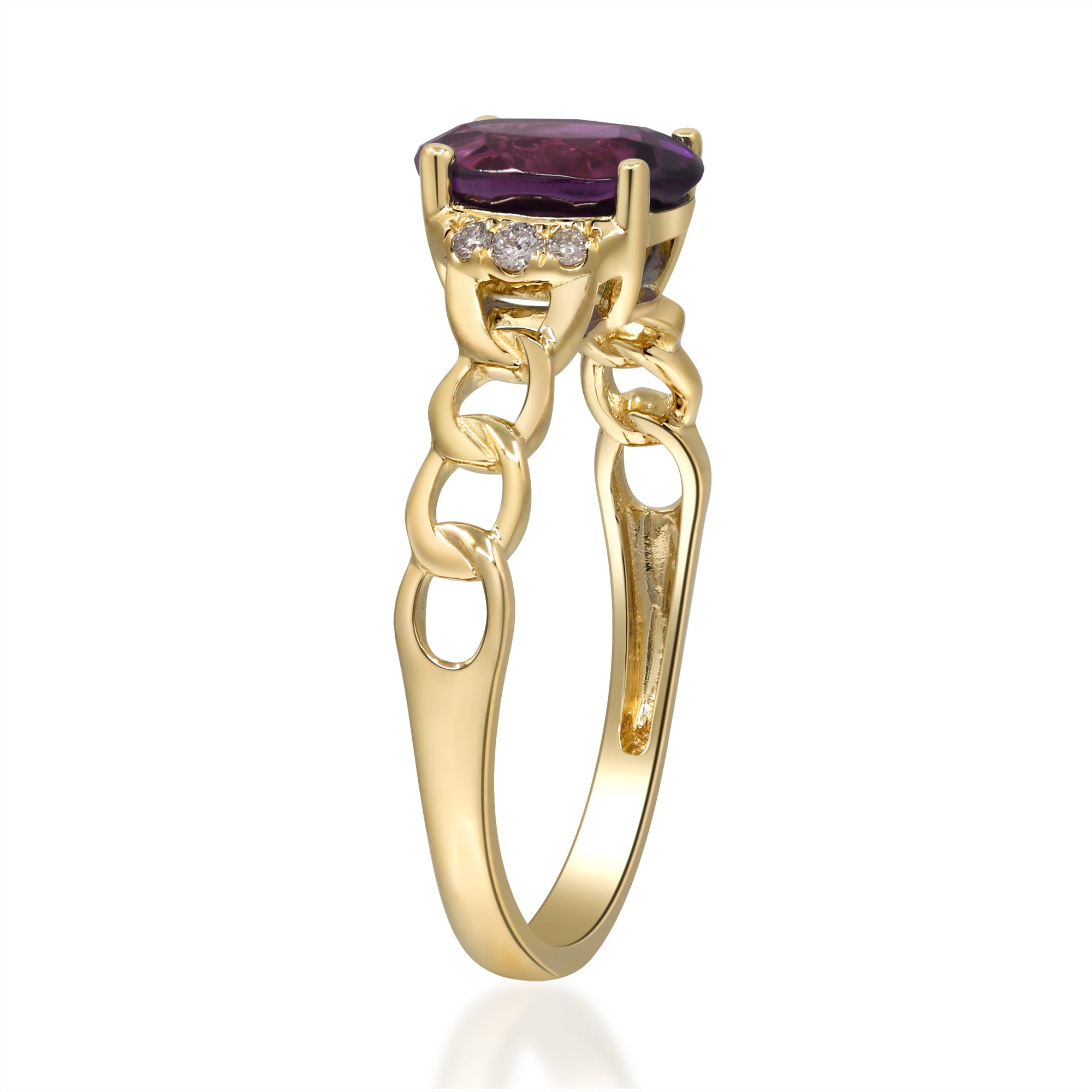 Stunning, timeless, and classy eternity Unique ring. Decorate yourself in luxury with this Gin & Grace ring. The 10K Yellow Gold jewelry boasts Oval-Cut Prong Setting Genuine Rhodolite (1 pcs) 1.49 Carat and White Diamond (6 pcs) 0.05 Carat accent stones for a lovely design. This ring weight 1.78 grams. Crafted with 10K Yellow Gold, this delicate Ring is polished to a high finish shine.