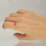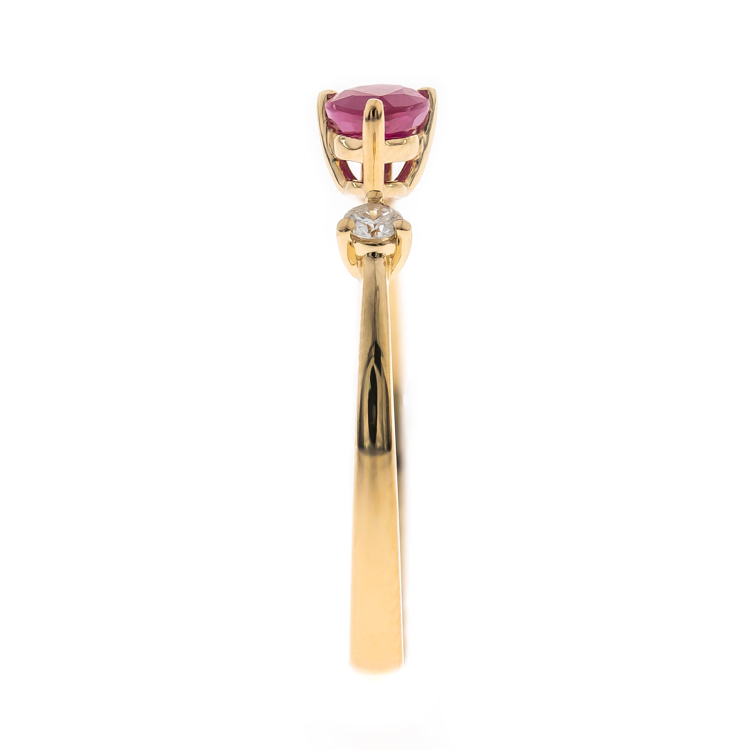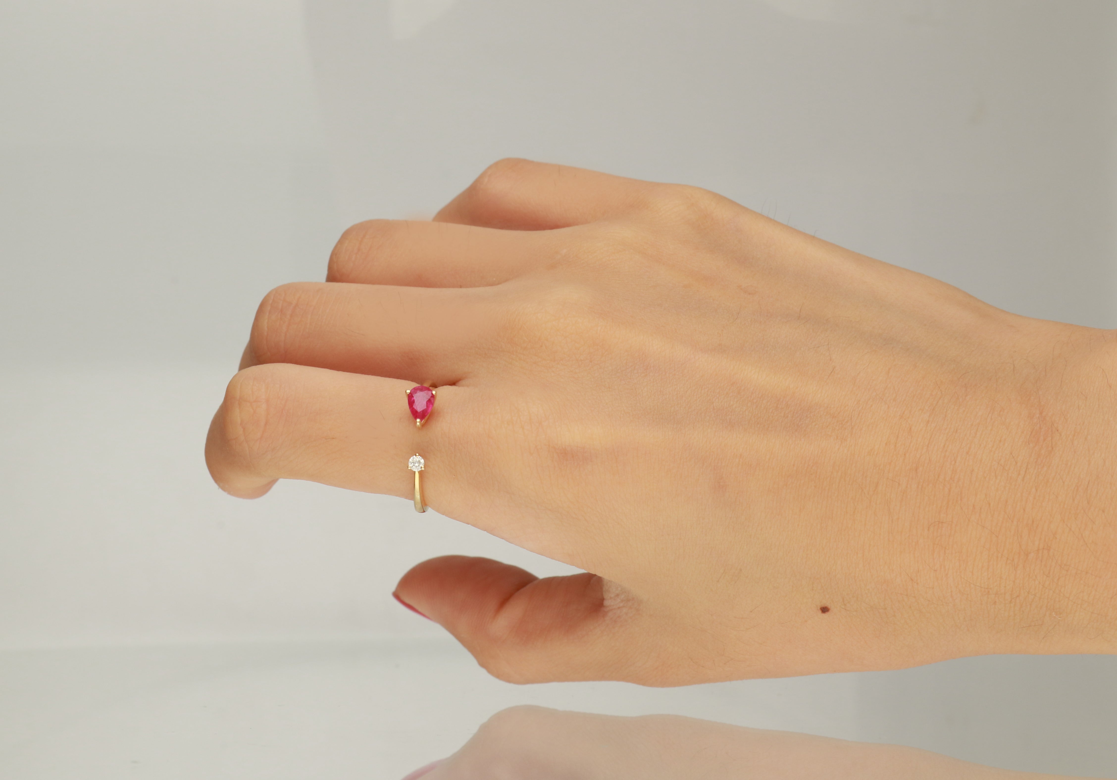 Stunning, timeless and classy eternity Unique ring. Decorate yourself in luxury with this The Gin & Grace ring. This ring is made up of 5x7 Pear-Cut Prong Setting Genuine Mozambique Ruby (1 pcs) 0.41 Carat and Round-Cut Prong Setting Natural Diamond (1 pcs) 0.5 Carat accent stones for a lovely design. This ring weighs 1.56 grams. The ring is crafted of shining 10-karat Yellow Gold and is completed by a highly polished finish.