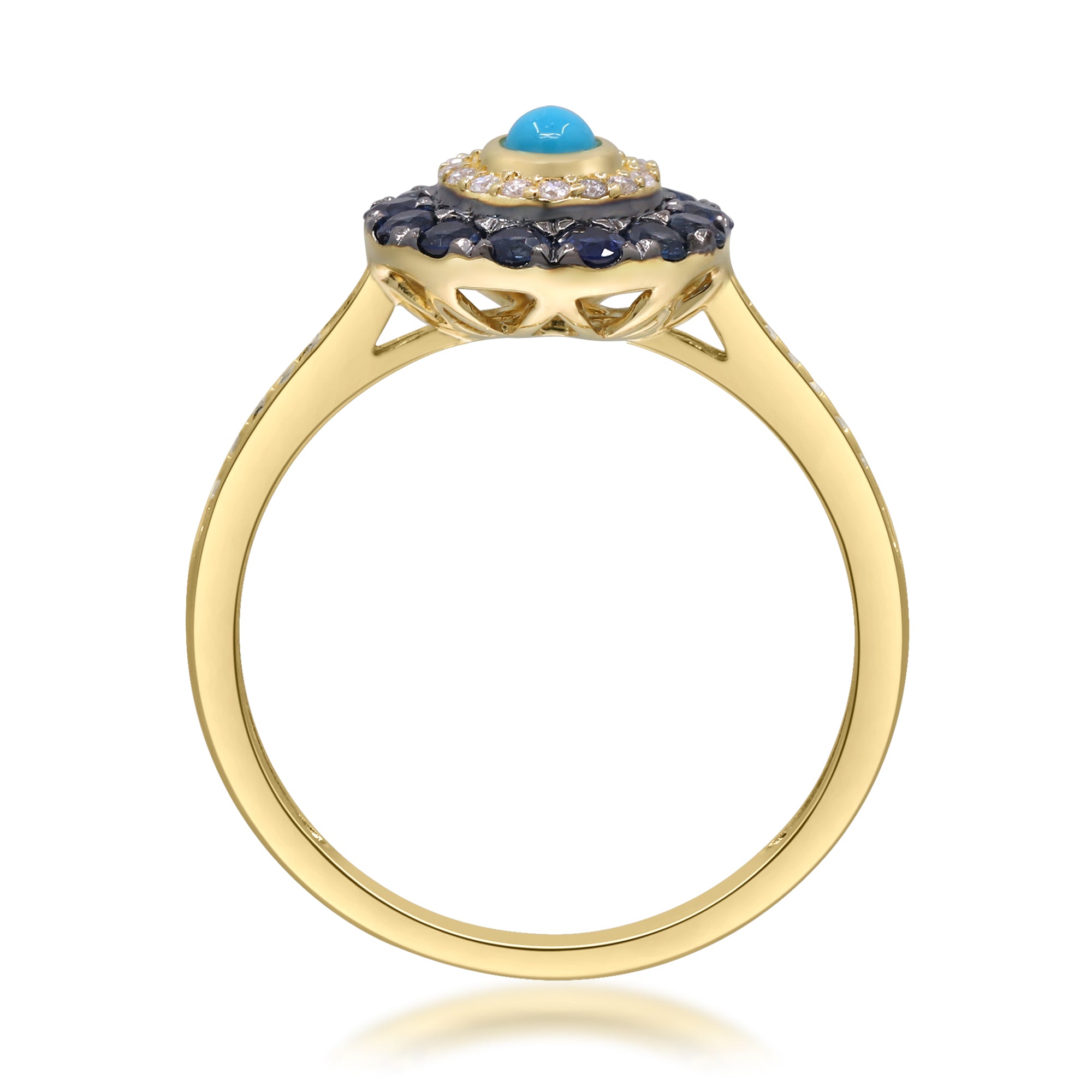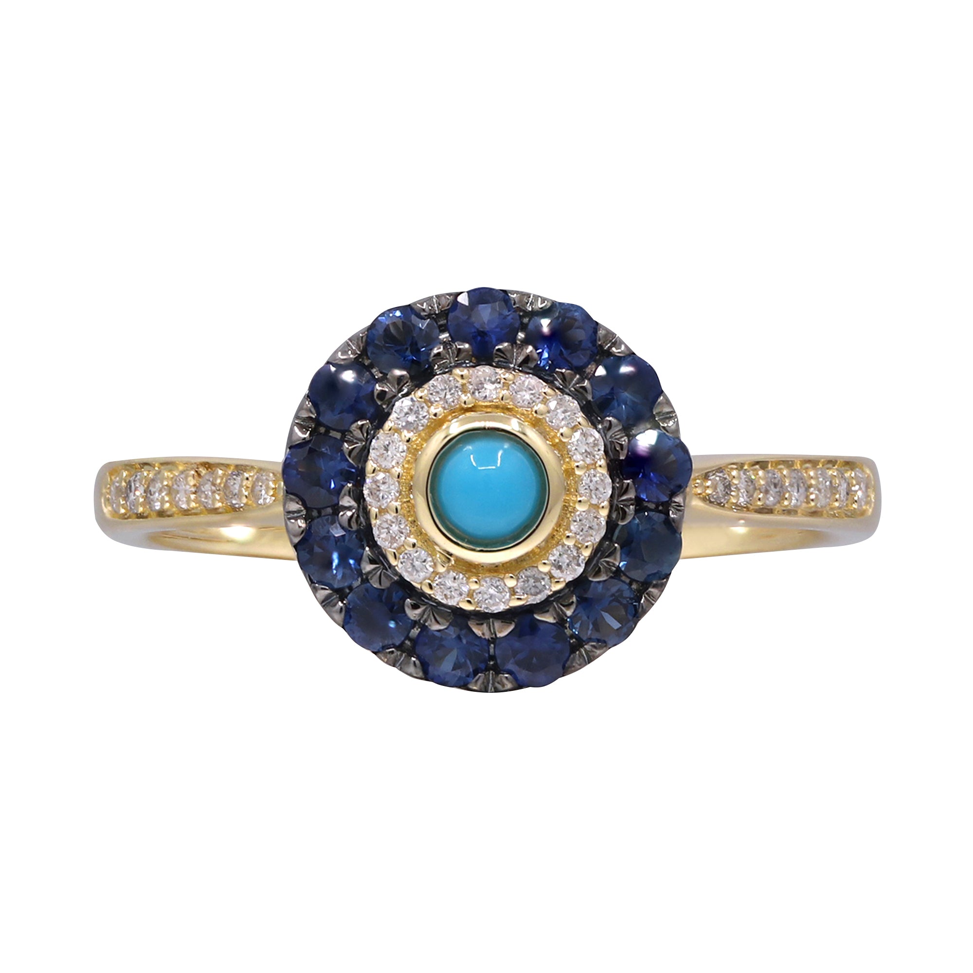 Decorate yourself in elegance with this Ring is crafted from 10-karat yellow gold 2.5 mm Round-cut Turquoise (1 pcs) 0.07 carat, 0.13 mm Round-cut Blue Sapphire (13 Pcs) 0.43 carat and round-cut white diamond (30 pcs) 0.12 carat. This Ring is weight 2.05 grams. This delicate Ring is polished to a high finish shine.
