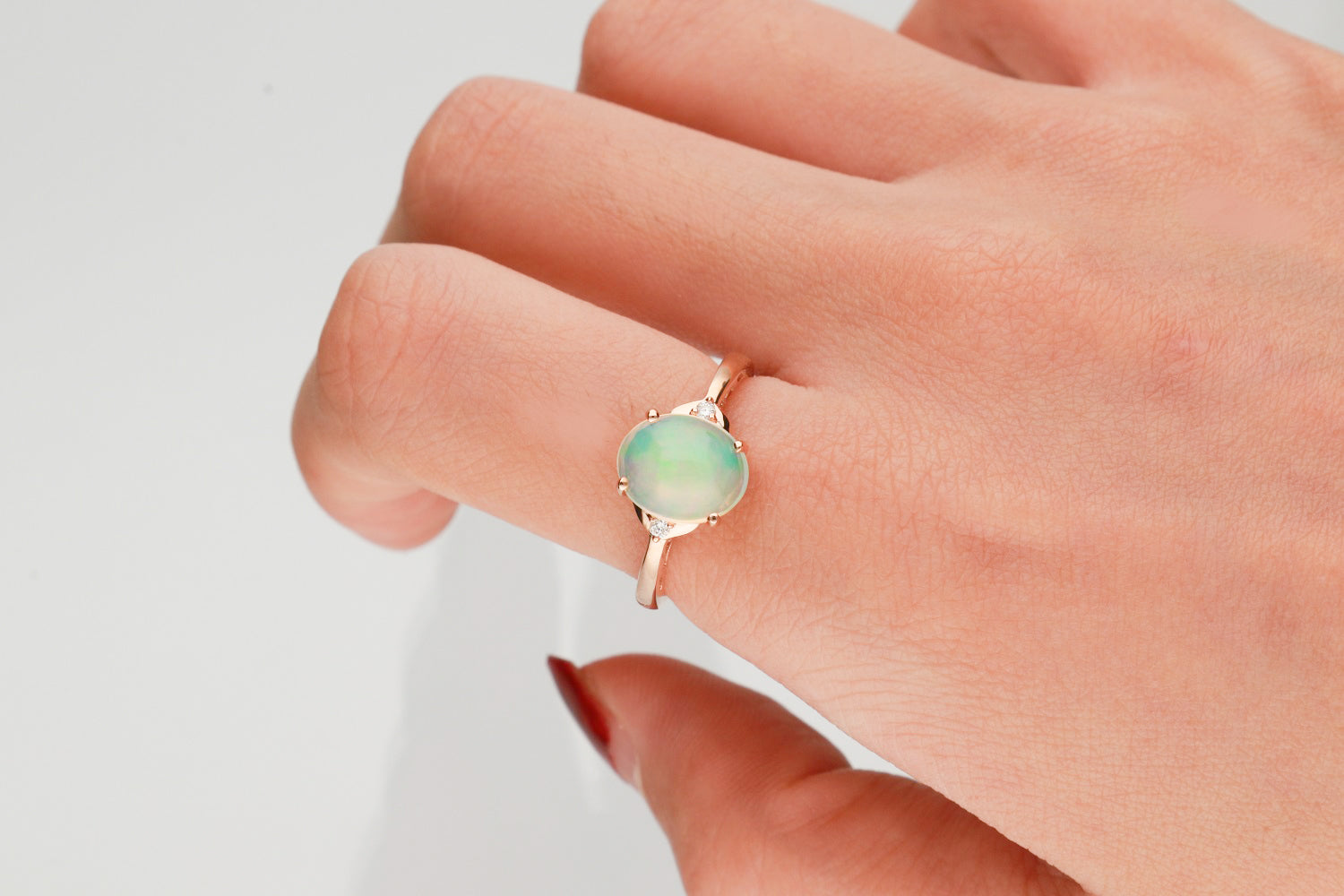Stunning, timeless and classy eternity Engagement ring. Decorate yourself in luxury with this Gin & Grace ring. This ring is made up of Oval-Cut Prong Setting Natural African Opal (1 pcs) 2.00 Carat and Round-Cut Prong Setting Diamond (2 pcs) 0.03 Carat accent stones for a lovely design. This ring is weight 2.18 grams. The ring is crafted of shining 10-karat Rose Gold and is completed by a highly polished finish.