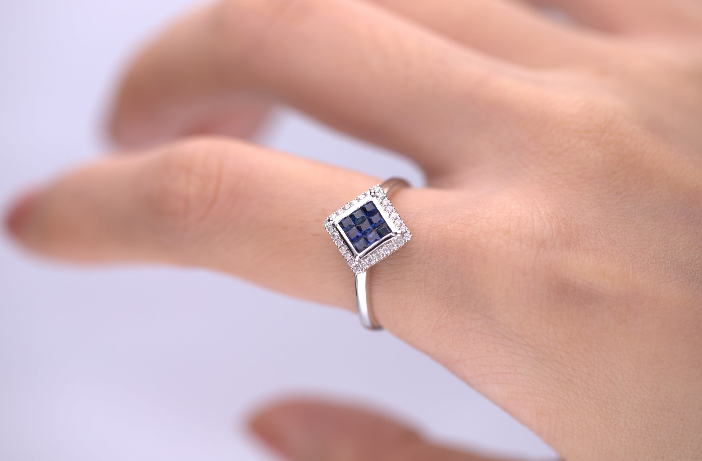 Stunning, timeless and classy eternity Engagement ring. Decorate yourself in luxury with this Gin & Grace ring. This ring is made up of 7MM Princess-Cut Invisible Setting Genuine Ceylon Blue Sapphire (9 pcs) 0.39 Carat and Round-Cut Prong Setting Natural white Diamond (28 pcs) 0.11 Carat accent stones for a lovely design. This ring is weight 2.38 grams. Crafted with 10k White Gold, this delicate Ring is polished to a high finish shine.