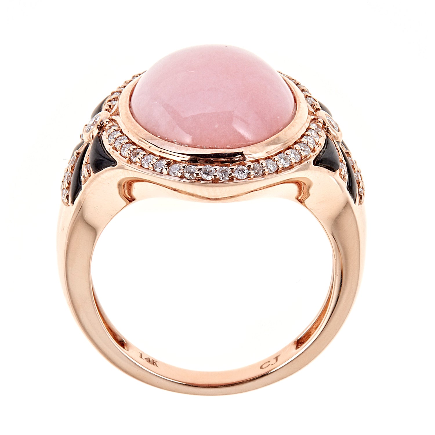 The brilliant beauty of this ring with its large Oval-Cabochon Genuine Peruvian Pink Opal, bright Fancy-Cabochon Gin & Grace Genuine Onyx Gemstones, and Bezel-Setting Diamonds. These dazzling stones are set beautifully into a high-polished ornate 14K yellow gold band by Gin and Grace. Designed for a Unique gift, this ring boasts elegance and high fashion. This jewelry is sure to offer an elegant look to any outfit and any occasion.