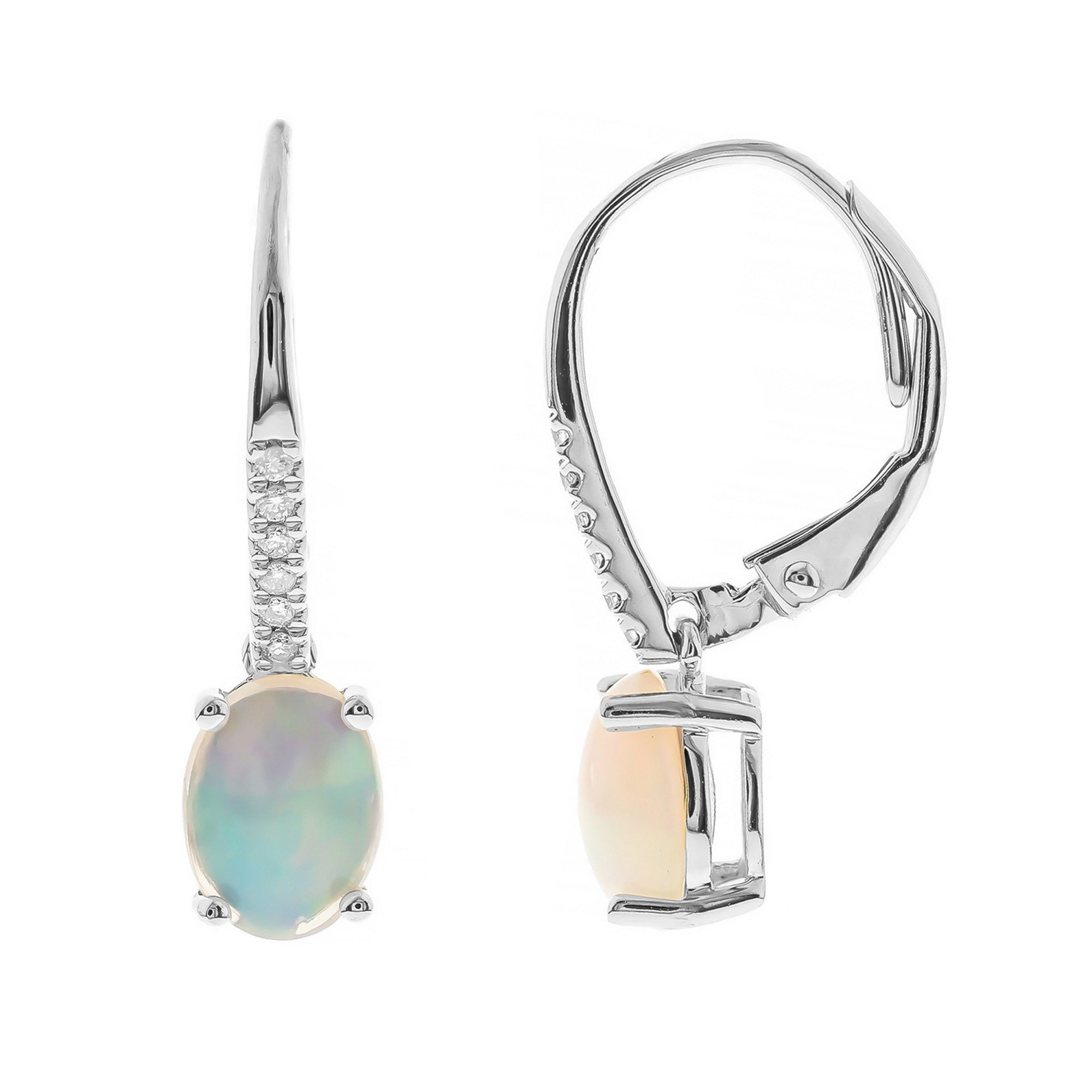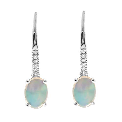 Decorate yourself in elegance with this Earring is crafted from 10-karat White Gold by Gin & Grace. This Earring is made up of 6X8 mm African Opal Oval shaped (2 pcs) 1.62 carat, Round-cut White Diamond (12 Pcs) 0.06 Carat. This Earring is weight 1.42 grams. This delicate Earring is polished to a high finish shine.