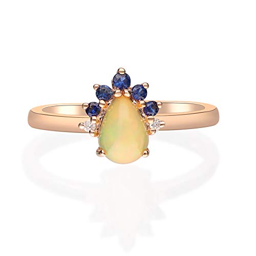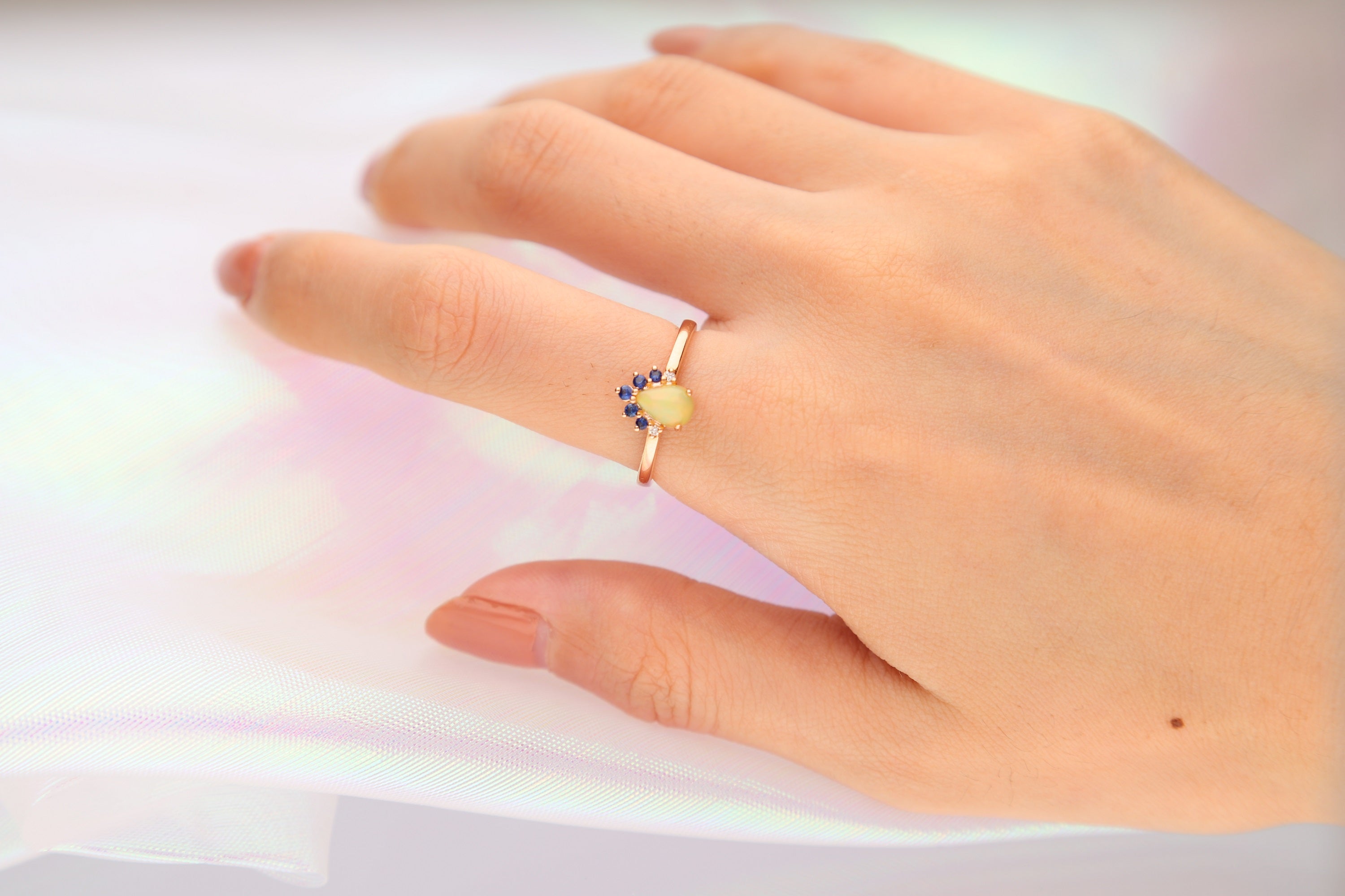 Stunning, timeless and classy eternity Unique Ring. Decorate yourself in luxury with this Gin & Grace Ring. The 14K Yellow Gold jewelry boasts Pear-Cut Prong Setting Natural Opal (1 pc) 0.41 Carat, Round-Cut Genuine Blue Sapphire (5 Pcs) 0.11, along with Natural Round cut white Diamond (2 Pcs) 0.02 Carat, accent stones for a lovely design. This Ring is weight 2.15 grams. Crafted with 14K Yellow Gold, this delicate Ring is polished to a high finish shine.