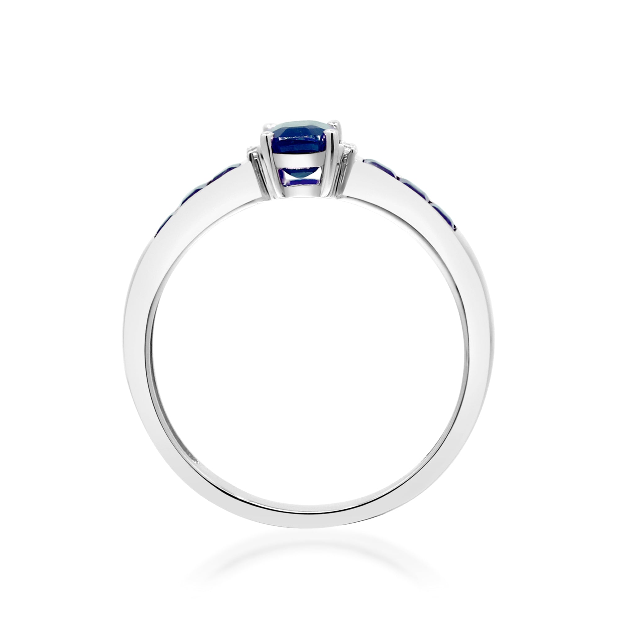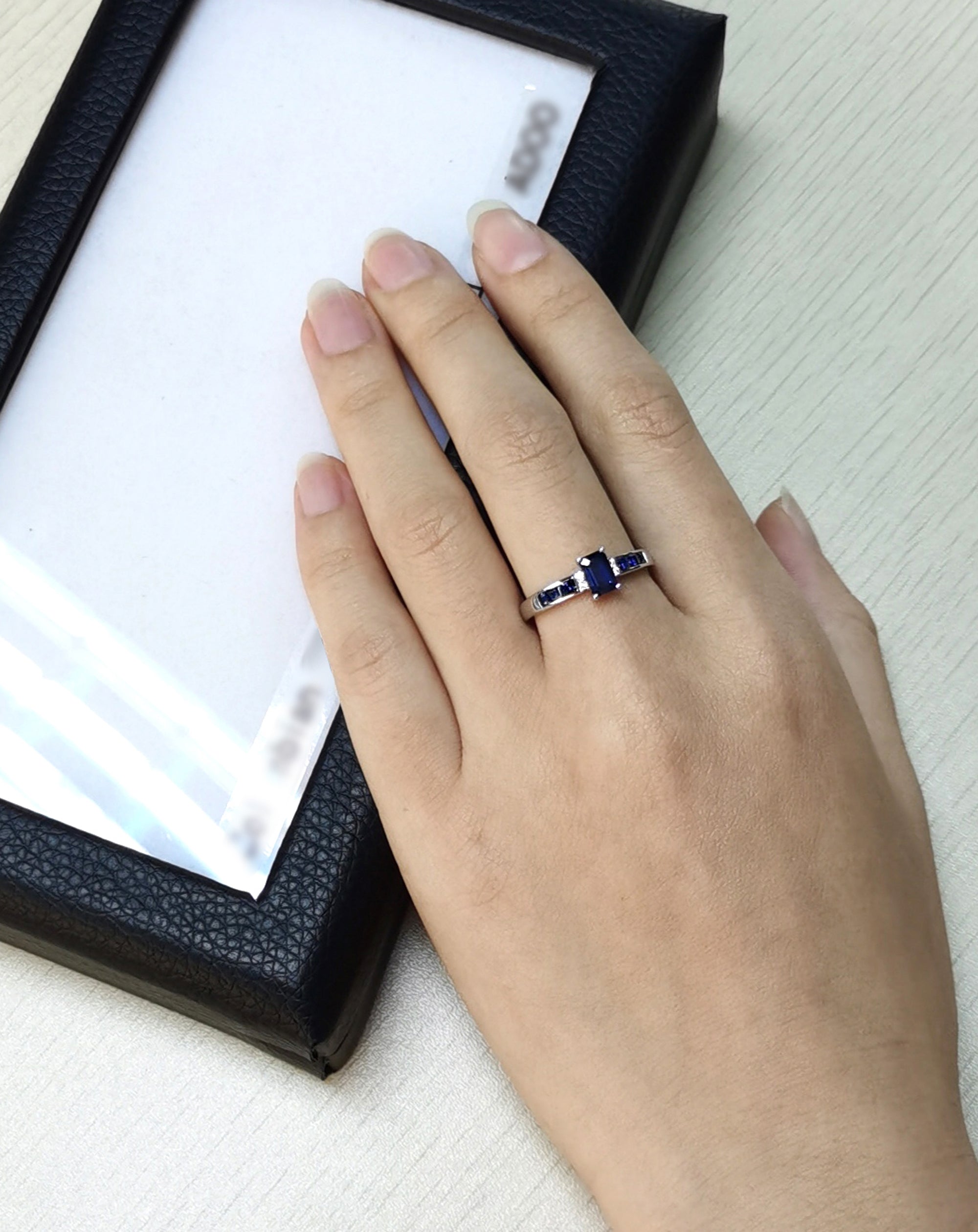 Decorate yourself in elegance with this Ring is crafted from 10-karat White Gold by Gin & Grace. This Ring is made up of 6x4 mm Emerald-Cut Ceylon Blue Sapphire (1 pcs) 0.60 carat, 2.0 mm Square-cut Ceylon Blue Sapphire (6 Pcs) 0.38 carat and Round-cut White Diamond (4 Pcs) 0.03 Carat. This Ring is weight 1.79 grams. This delicate Ring is polished to a high finish shine.