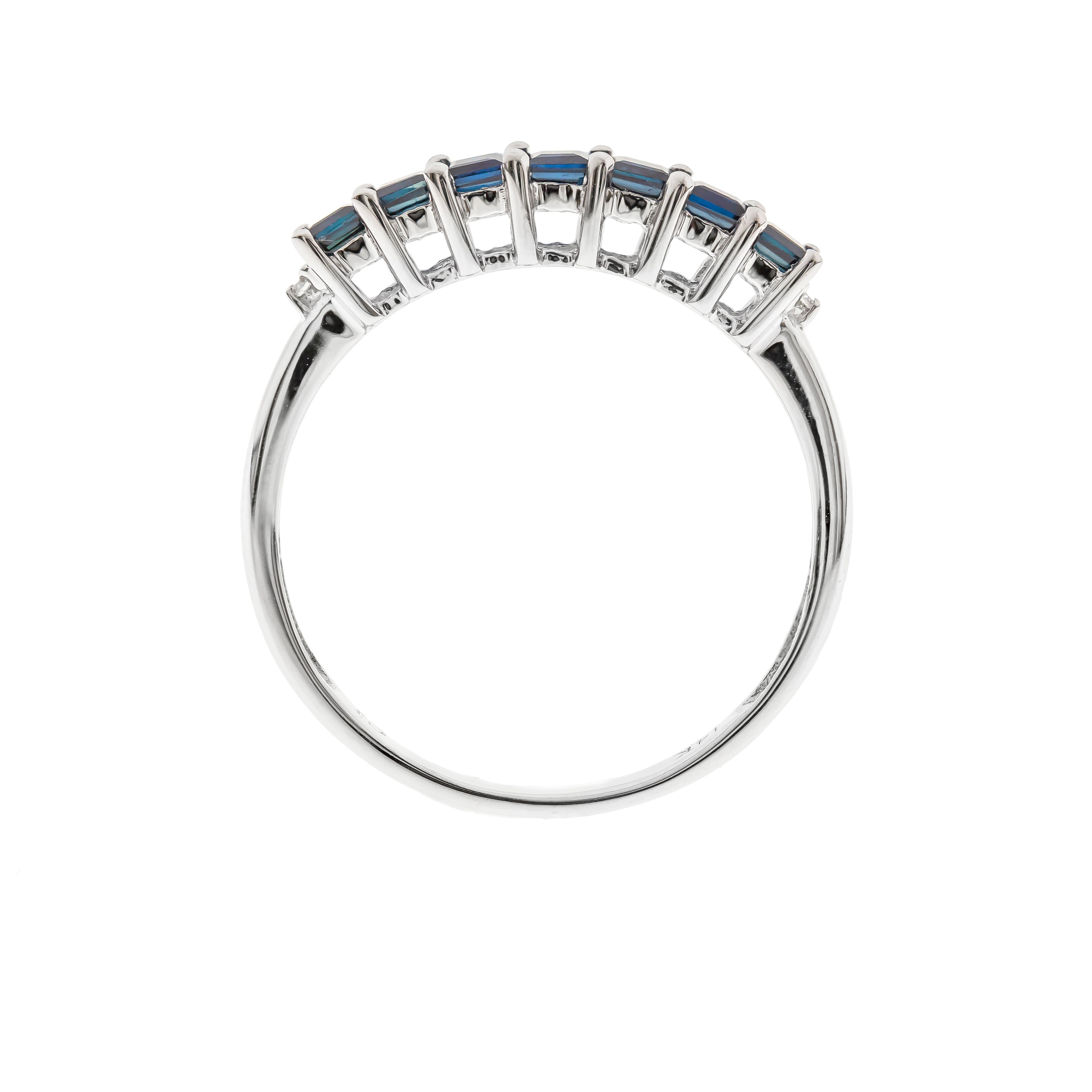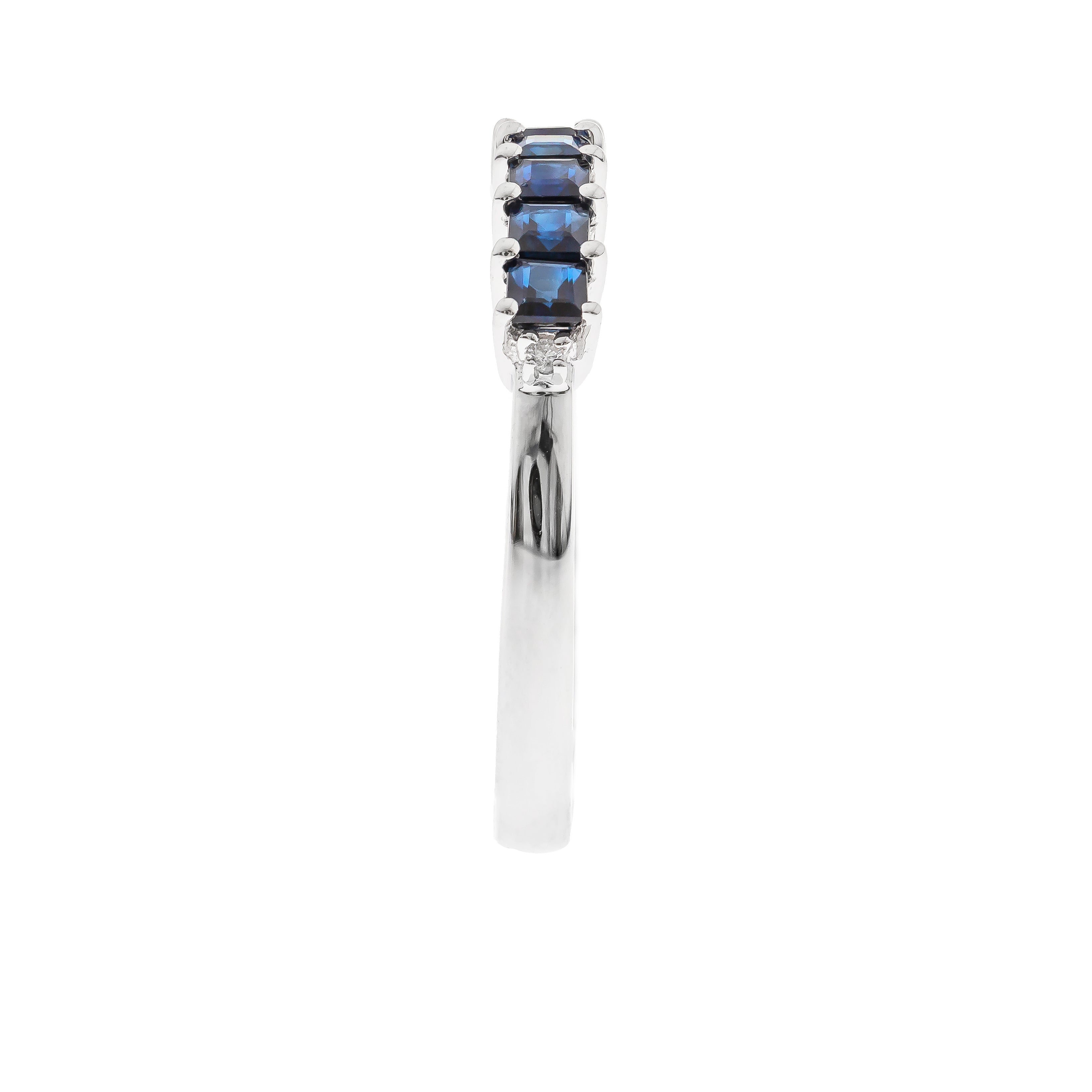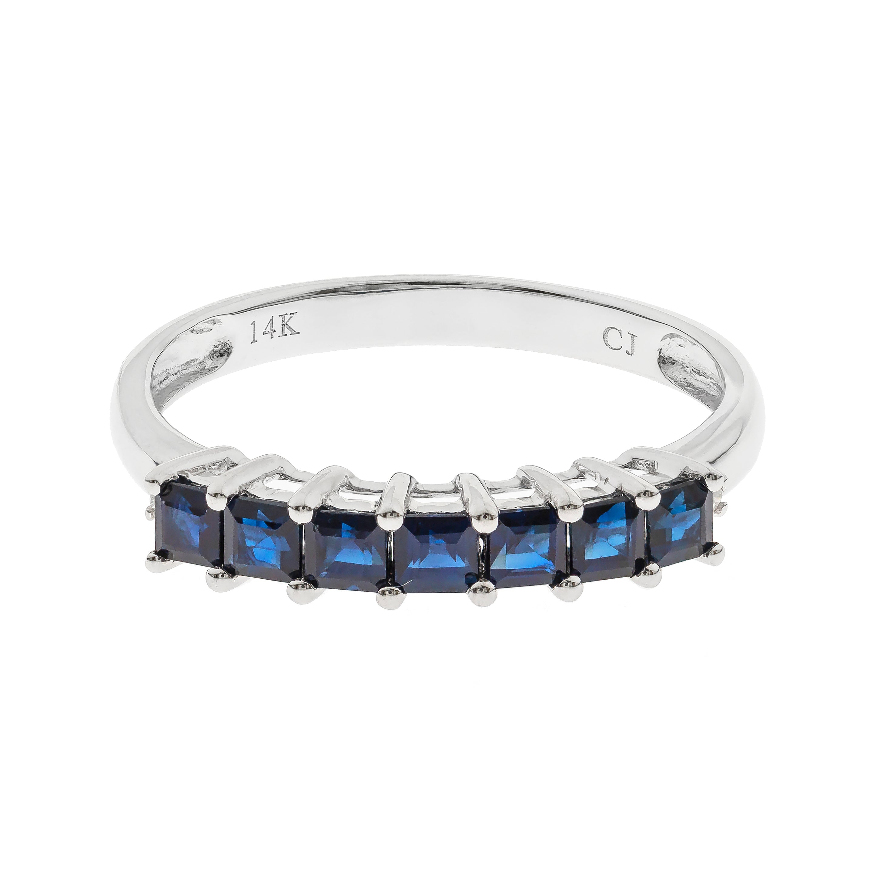Decorate yourself in elegance with this Ring is crafted from 14-karat White Gold by Gin & Grace. This Ring is made up of square-cut blue sapphire (7 Pcs) 0.82 carat and round-cut White diamond (2 pcs) 0.01 carat. This Ring is weight 1.56 grams. This delicate Ring is polished to a high finish shine.