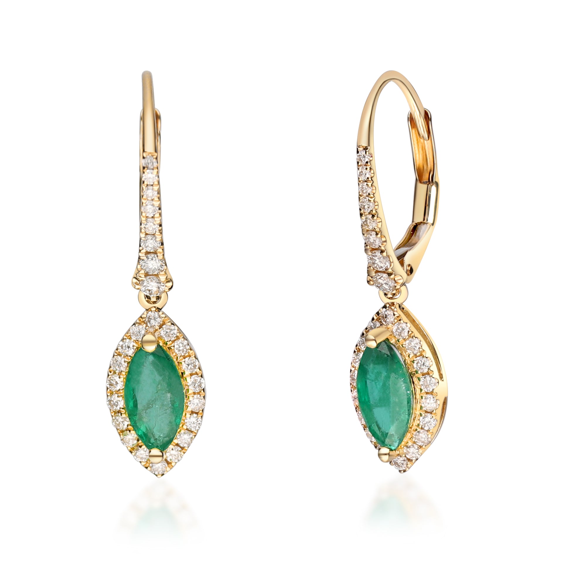 Decorate yourself in elegance with this Zambian Earrings is crafted from 14-karat Yellow Gold by Gin & Grace. This Earrings is made up of Marquise-Cut (4x8mm 2 pcs) 0.88 carat Zambian Emerald and Round-Cut White Diamond (52 Pcs) 0.35 Carat. This Earrings is weight 1.67 grams. This delicate Earrings is polished to a high finish shine.