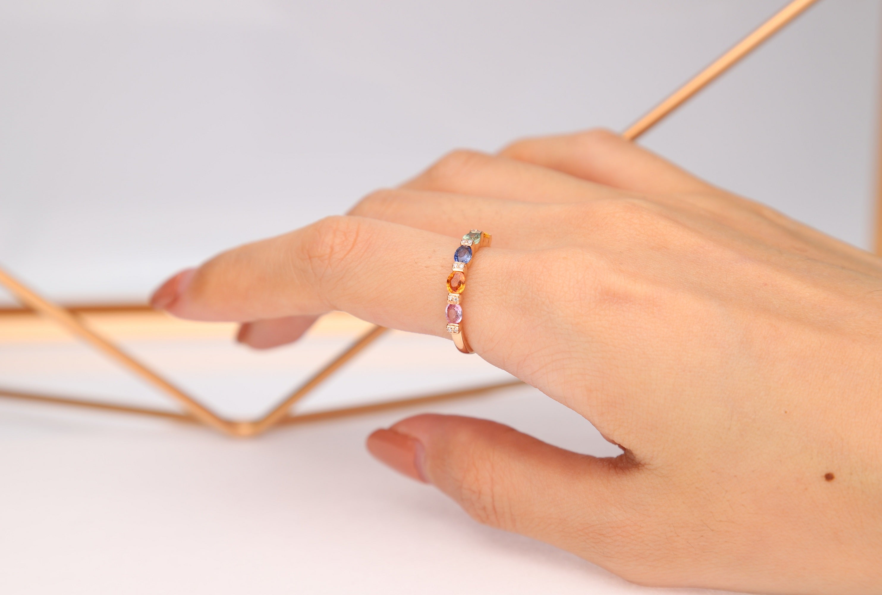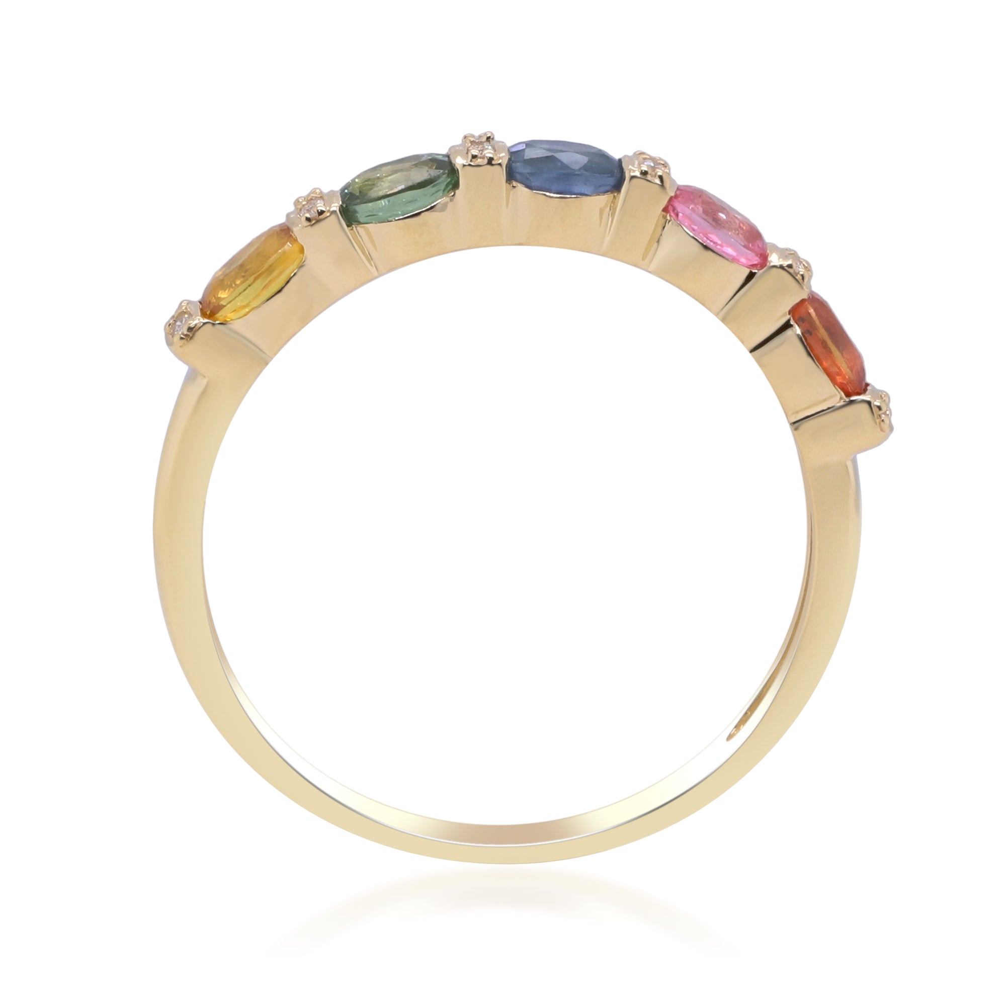 Stunning, timeless and classy eternity Unique Ring. Decorate yourself in luxury with this Gin & Grace Ring. The 10K Yellow Gold jewelry boasts Oval-Cut Prong Setting Genuine Multi Sapphire (5 pcs) 1.30 Carat, along with Natural Round cut white Diamond (12 Pcs) 0.03 Carat, accent stones for a lovely design. This Ring is weight 1.59 grams. Crafted with 10K Yellow Gold, this delicate Ring is polished to a high finish shine.