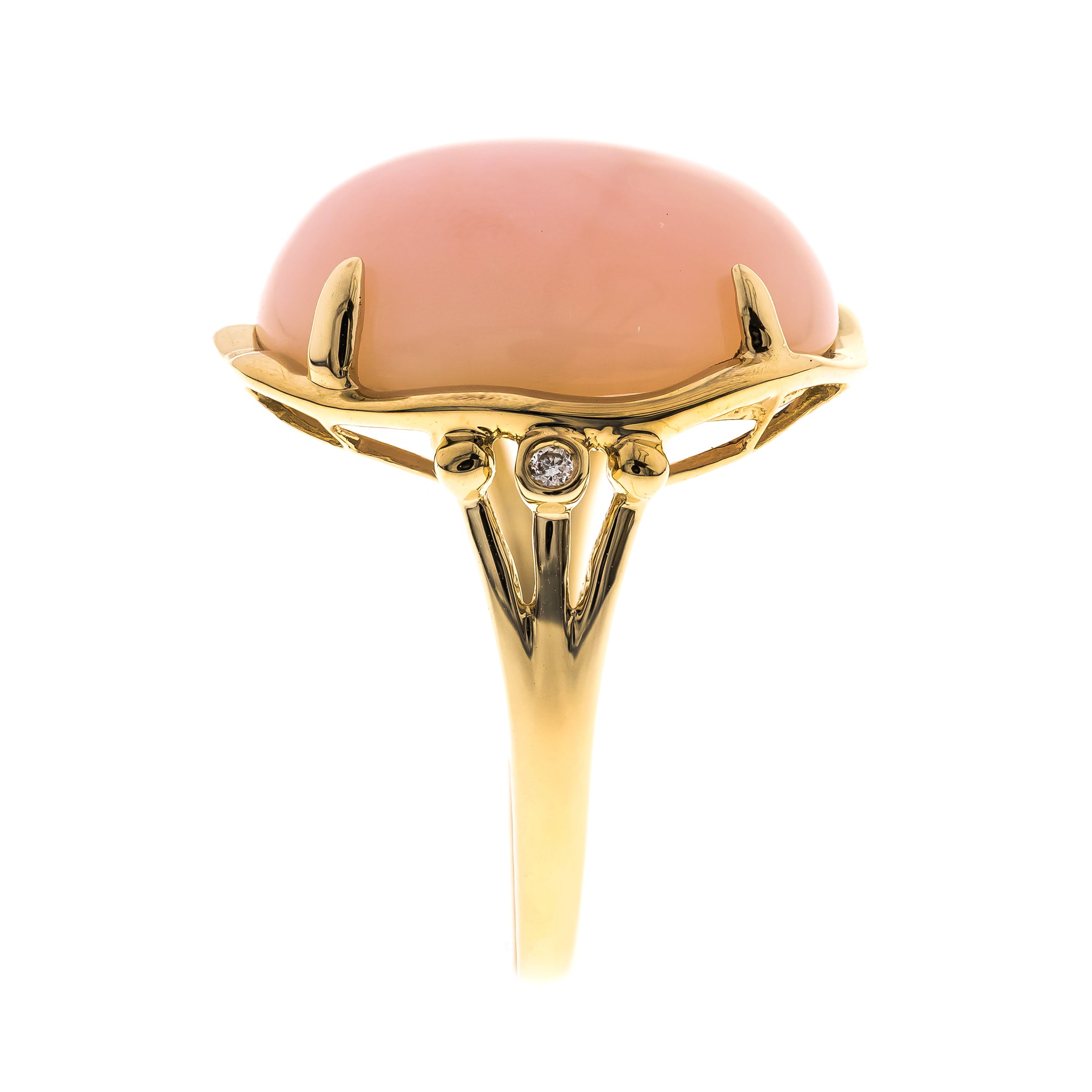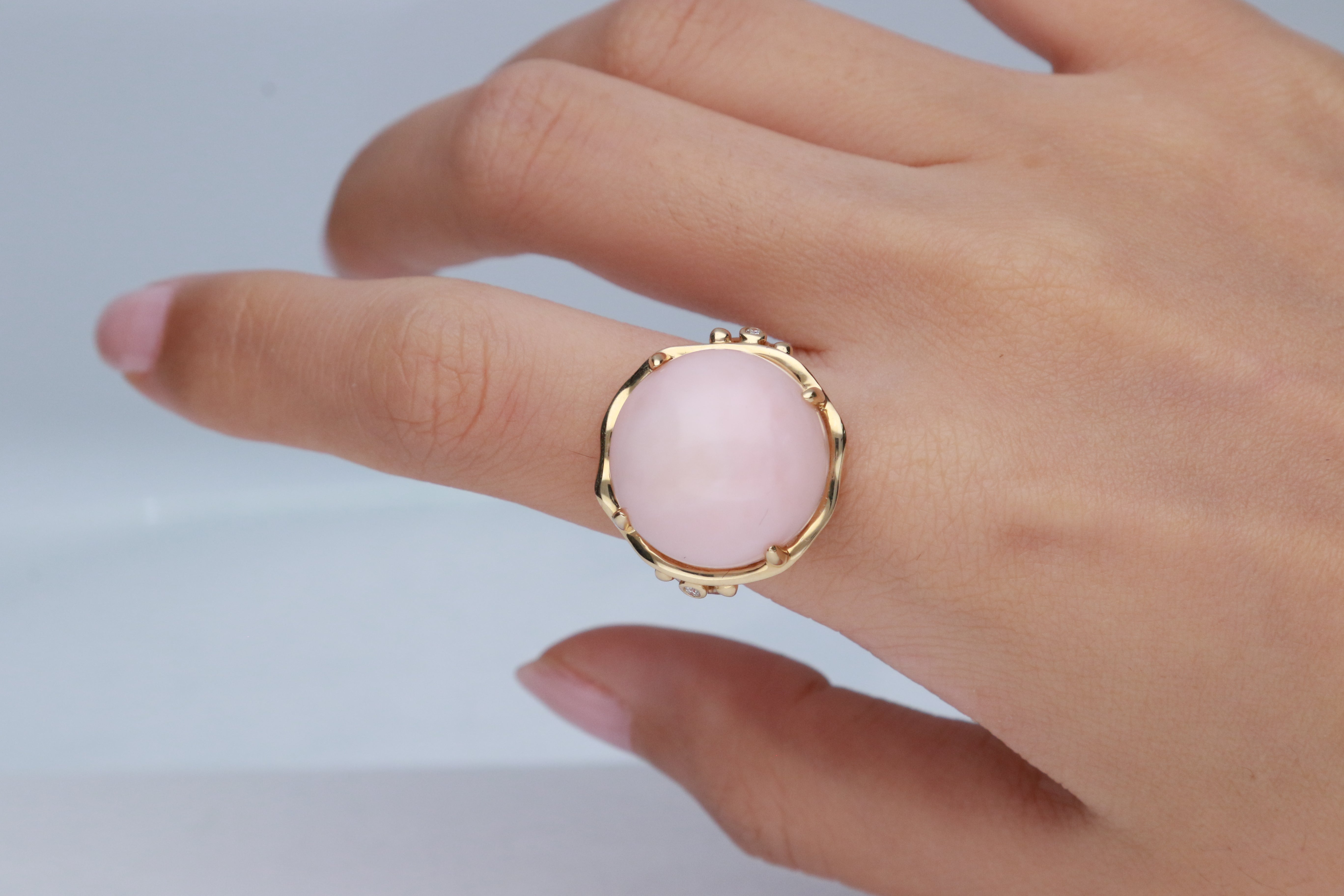 Decorate yourself in luxury with this Gin & Grace ring. The 14k Yellow Gold jewelry boasts Round-Cab Prong Setting Peruvian Pink Opal stone (1pcs) 16.29 Carat, and Round-Cut Prong Setting (2pcs) 0.02 Carat white diamond accent stones for a glimmering design. This ring is weight 3.52 grams. Natural Diamonds with good quality I1-I2. One of a kind Crafted with 14K Yellow Gold, this delicate Ring is polished to a high finish shine.
