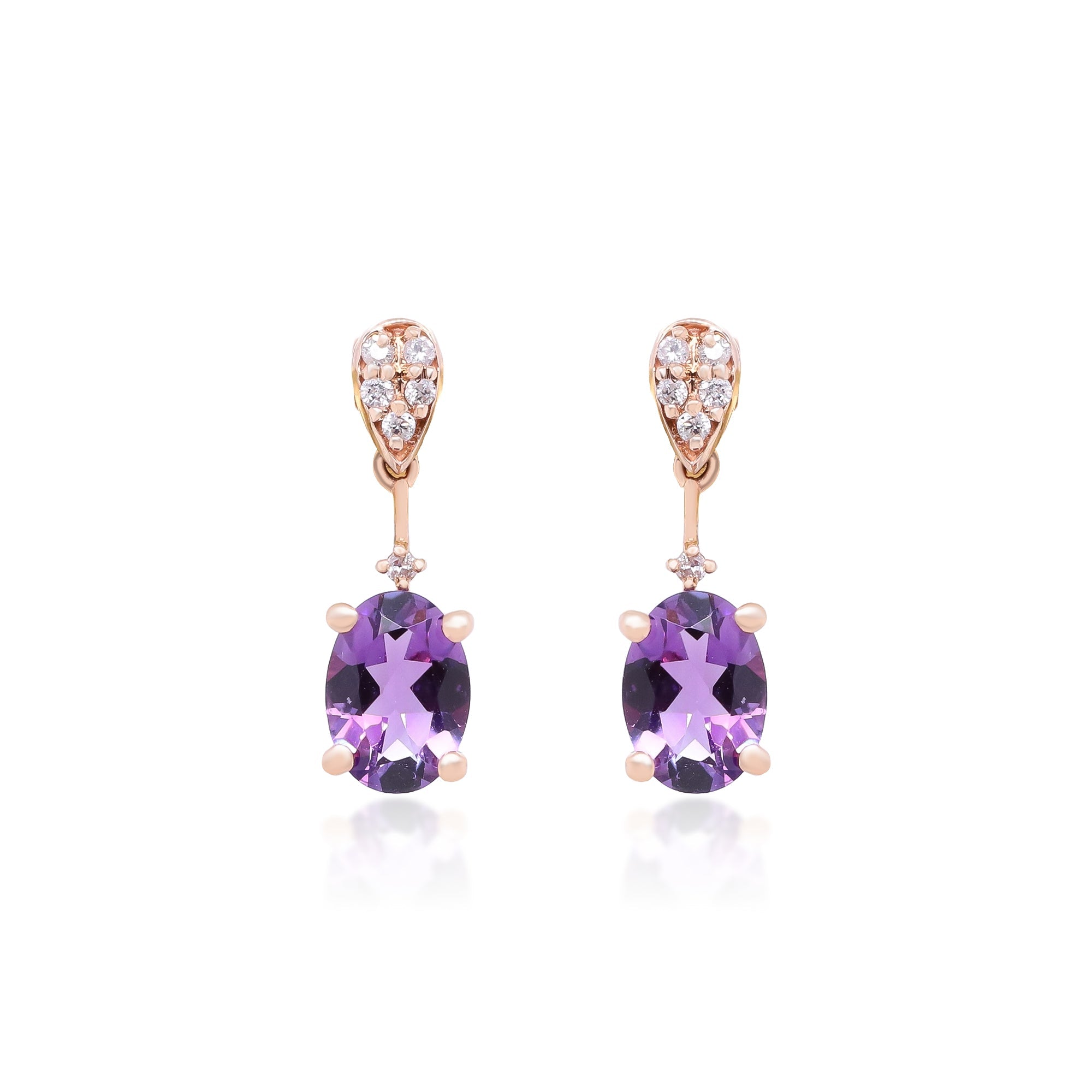 Decorate yourself in elegance with this Earring is crafted from 14K Rose Gold by Gin & Grace Earring. The jewelry boasts of Oval-Cut prong setting Amethyst (2 pcs) 1.45 Carat and Round-Cut prong setting Diamond (12 pcs) 0.08 Carat. This Earring is weight 1.67 grams. This delicate Earring is polished to a high finish shine. Simple lever back clasps keep these earrings securely fastened.