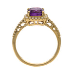 Stunning, timeless and classy eternity Unique Ring. Decorate yourself in luxury with this Gin & Grace Ring. The 10K Yellow Gold jewelry boasts Cushion-Cut Prong Setting Natural Amethyst (1 pc) 1.44 Carat, along with Natural Round cut white Diamond (40 Pcs) 0.22 Carat, accent stones for a lovely design. This Ring is weight 1.82 grams. Crafted with 10K Yellow Gold, this delicate Ring is polished to a high finish shine.