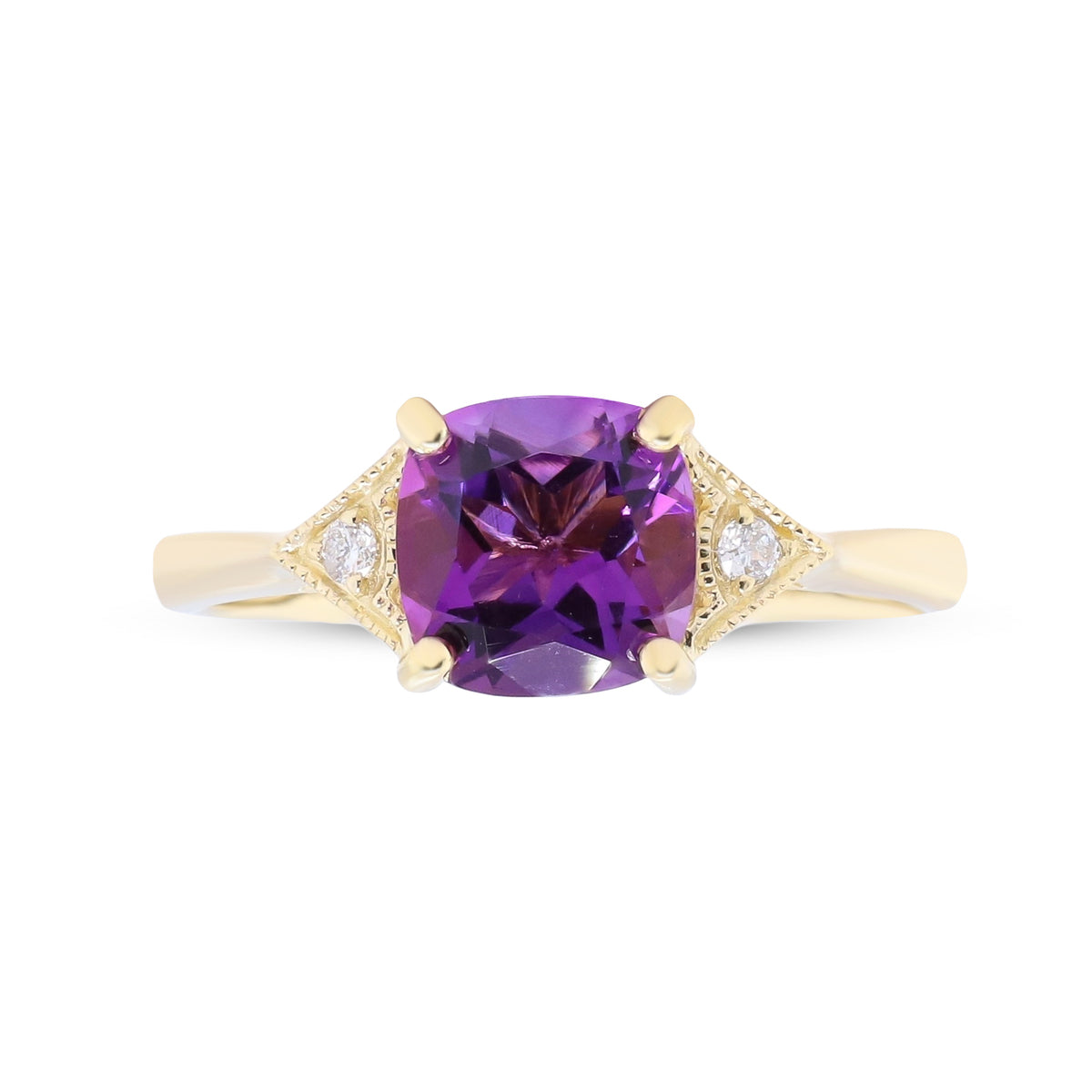 Decorate yourself in elegance with this Ring is crafted from 10-karat Yellow Gold by Gin & Grace. This Ring is made up of cushion-cut Brazilian Amethyst (1 Pcs) 1.44 carat and round-cut White diamond (2 pcs) 0.04 carat. This Ring is weight 1.90 grams. This delicate Ring is polished to a high finish shine.