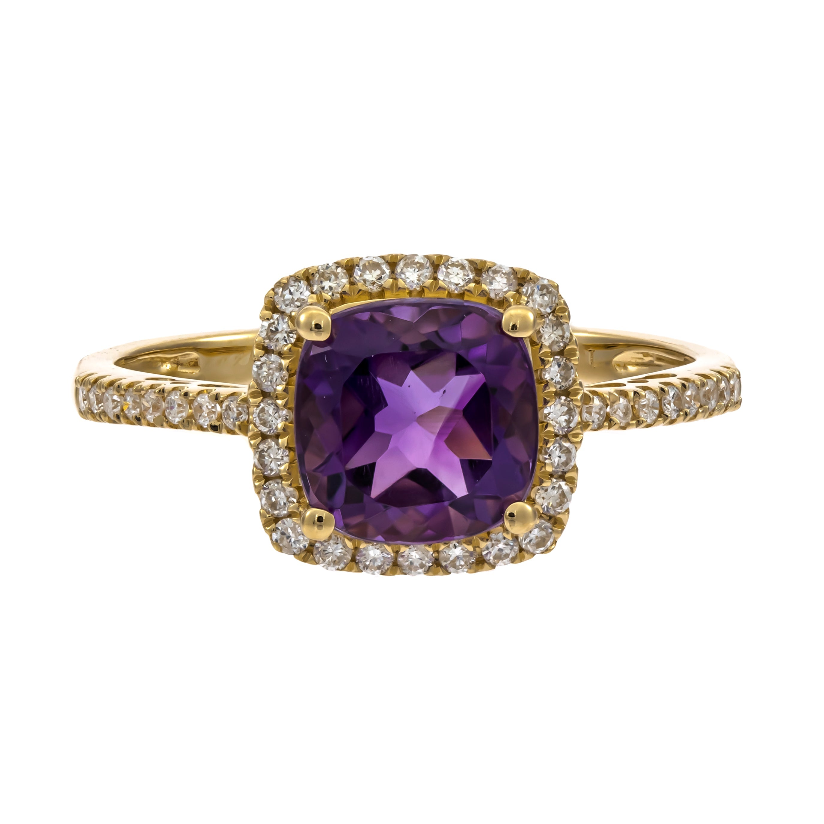 Stunning, timeless and classy eternity Unique Ring. Decorate yourself in luxury with this Gin & Grace Ring. The 10K Yellow Gold jewelry boasts Cushion-Cut Prong Setting Natural Amethyst (1 pc) 1.44 Carat, along with Natural Round cut white Diamond (40 Pcs) 0.22 Carat, accent stones for a lovely design. This Ring is weight 1.82 grams. Crafted with 10K Yellow Gold, this delicate Ring is polished to a high finish shine.