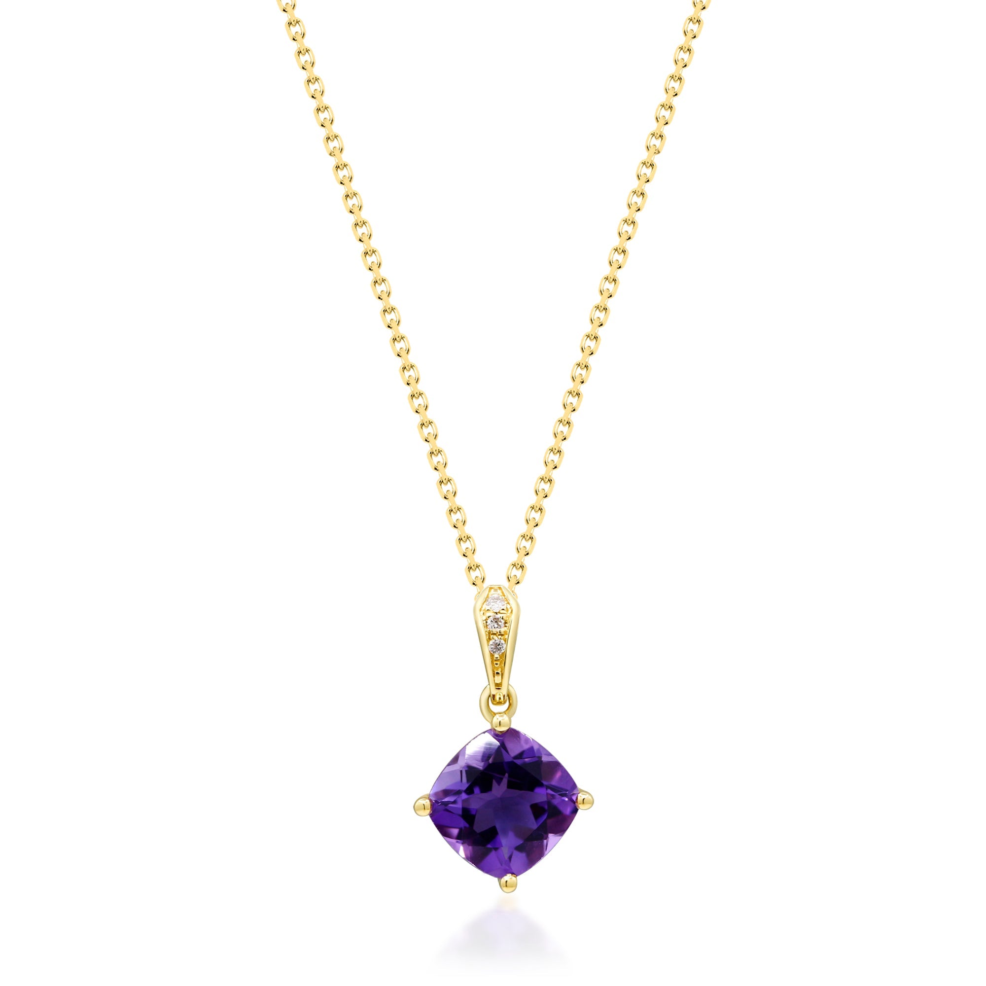Decorate yourself in elegance with this Pendant is crafted from 10-karat Yellow Gold by Gin & Grace. This Pendant is made up of 7.0 mm Cushion-cut Brazilian Amethyst (1 pcs) 1.44 carat and Round-cut White Diamond (3 Pcs) 0.01 Carat. This Pendant is weight 1.79 grams. This delicate Pendant is polished to a high finish shine.