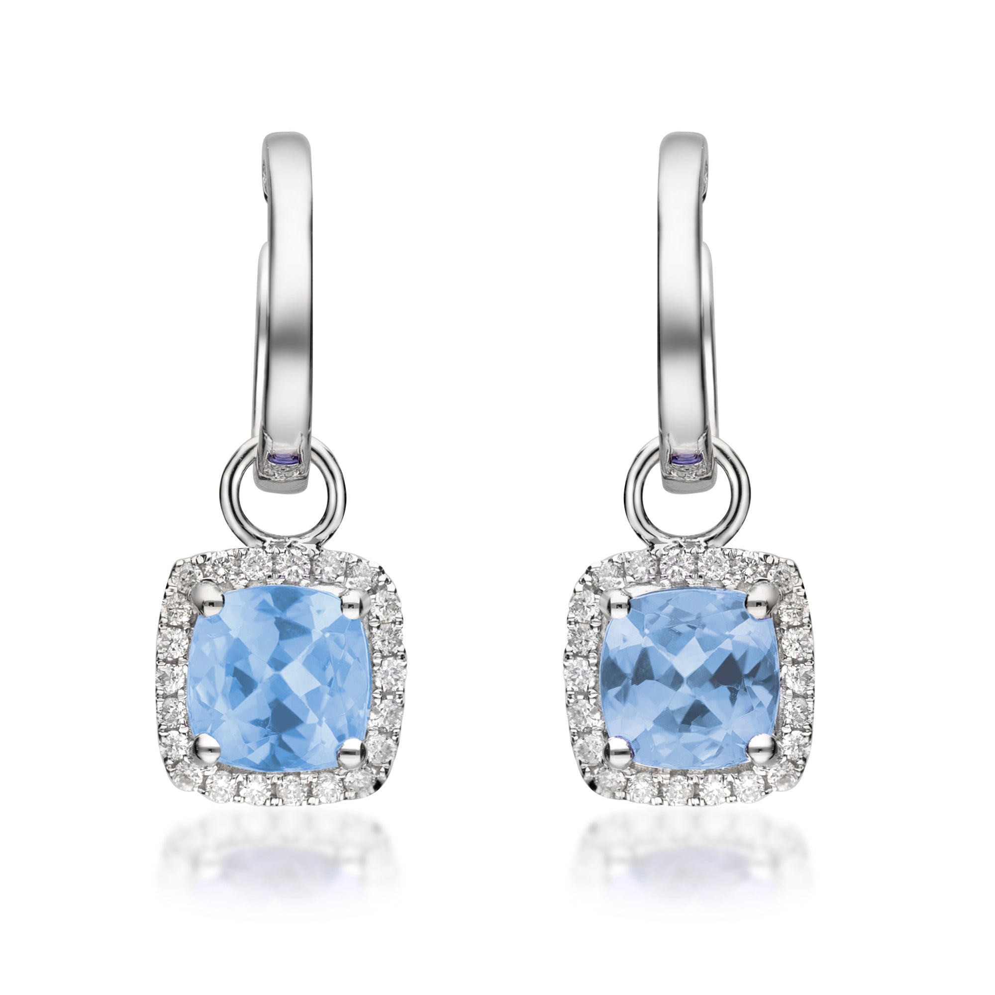 Stunning, timeless and classy eternity Engagement Earring . Decorate yourself in luxury with this Gin & Grace Earring. This Earring is made up of 60.MM Cushion-Cut Prong Setting Genuine Brazilian Aquamarine (2 pcs) 1.75 Carat and Round-Cut Prong Setting Natural Diamond (44 pcs) 0.22 Carat accent stones for a lovely design. This Earring is weight 2.56 grams. The Earring is crafted of shining 14-karat White Gold and is completed by a highly polished finish.