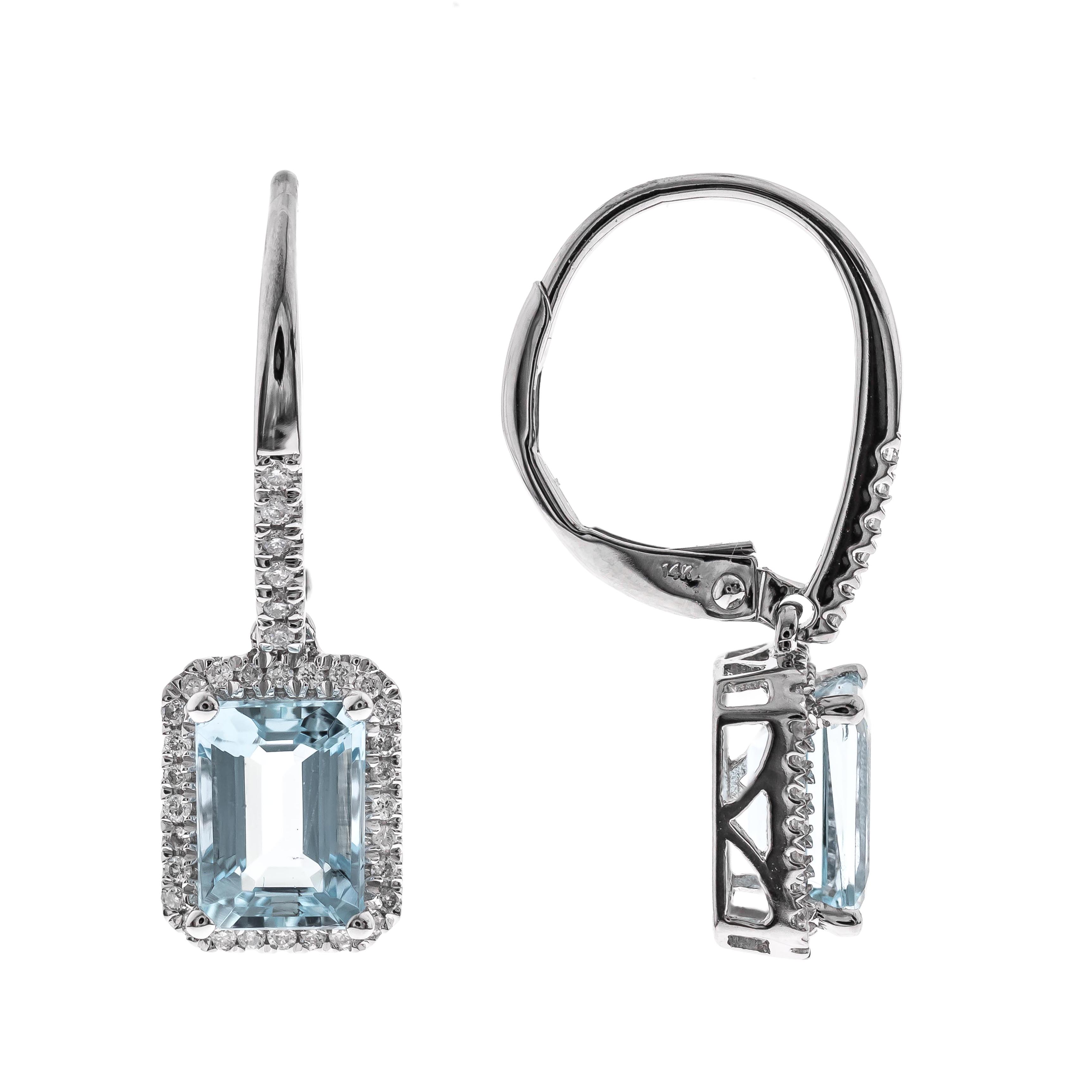 Decorate yourself in elegance with this Earring is crafted from 14-karat White Gold by Gin & Grace. This Earring is made up of Emerald-Cut Brazilian Aquamarine (2 pcs) 1.93 carat and Round-cut White Diamond (68 pcs) 0.20 Carat. This Earring is weight 2.33 grams. This delicate Earring is polished to a high finish shine.