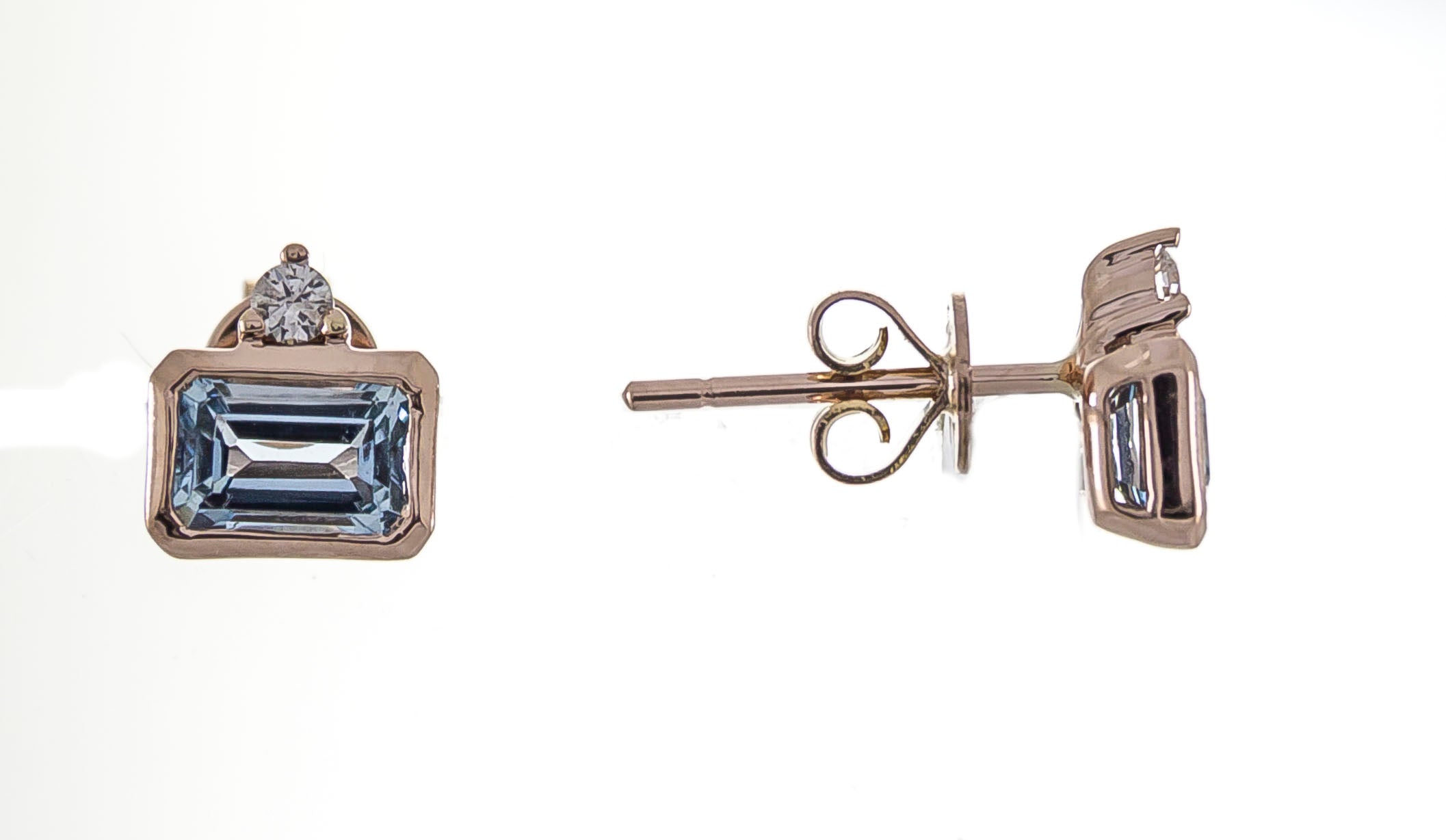 Decorate yourself in elegance with this Earring is crafted from 14K Rose Gold by Gin & Grace Earring. This Earring is made up of Emerald-Cut prong setting blue color Brazilian Aquamarine (2 pcs) 1.12 Carat and Round-Cut prong setting Diamond (2 pcs) 0.07 Carat. This Earring is weight 1.33 grams. This delicate Earring is polished to a high finish shine. Simple leverback clasps keep these earrings securely fastened.