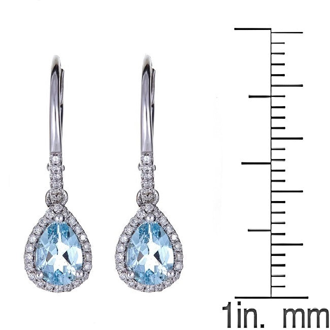 Aquamarine gemstones hang from each earring, secured by prongs, and set inside a halo of white diamonds. The polished 14k white gold adds tradition and versatility to this beautiful jewelry. Style: Dangle Gemstone colors: Blue Gemstone shapes: Pear Two prong-set pear-cut aquamarine each measure 5 mm wide x 7 mm long Gemstone weight: 1.18 carats Total gemstone weight: 1.18 carats Diamonds: 56 Diamond cut: Round-cut measure 1 mm Diamond weight: 0.20 carats Color: G-H Clarity: I1-I2 Setting: Prong-set Metal: 14k white gold Finish: High polish Clasp: Lever back Metal weight: 1.89 grams Earring dimensions: 7 mm wide x 25 mm long x 4 mm deep.