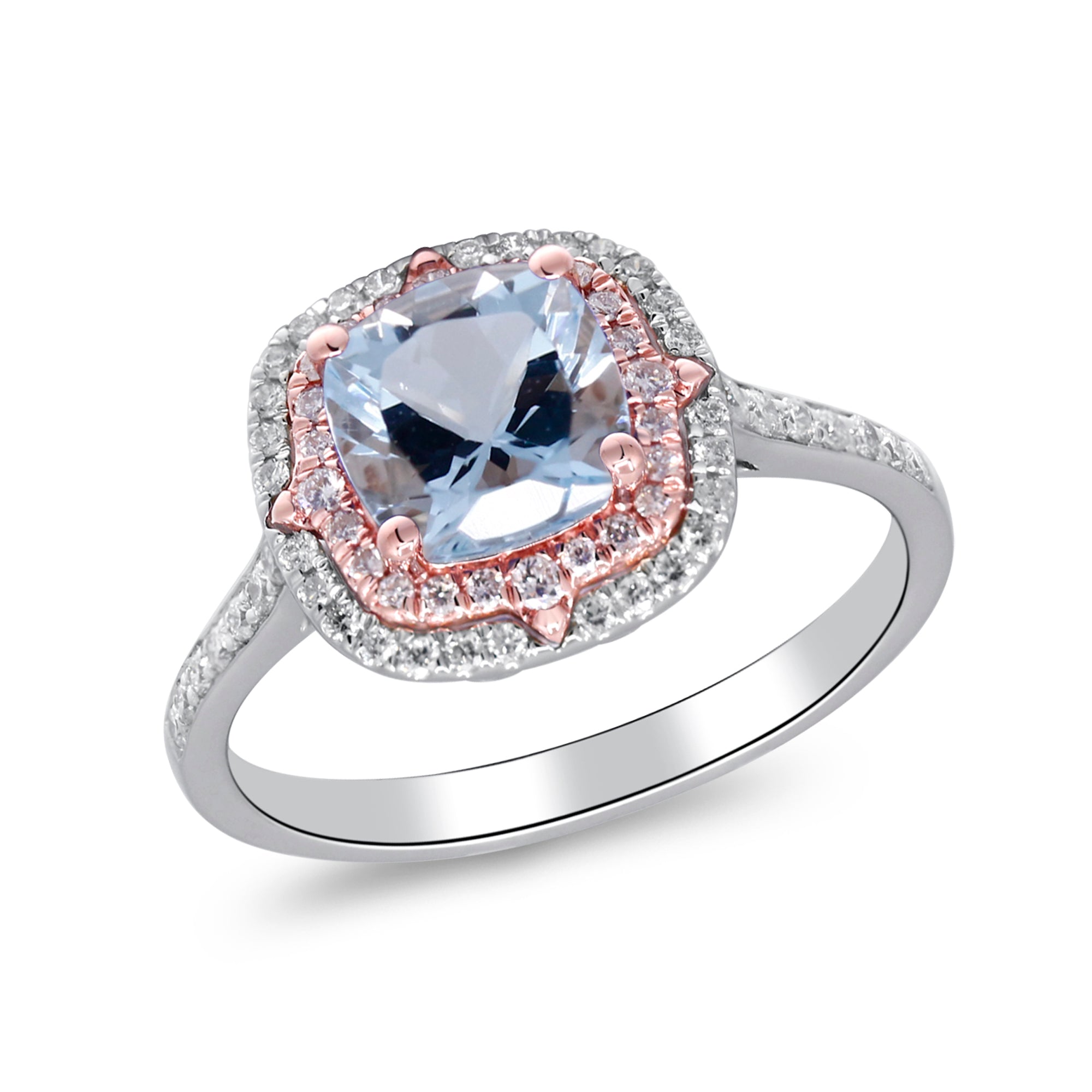 Decorate yourself in elegance with this Ring is crafted from 14K Two Tone Gold by Gin & Grace. This Ring is made up of 7.0 mm Cushion-Cut Brazilian Aquamarine (1 Pcs) 1.41 carat and Round-cut White Diamond (66 Pcs) 0.30 carat. This Ring is weight 2.78 grams. This delicate Ring is polished to a high finish shine.