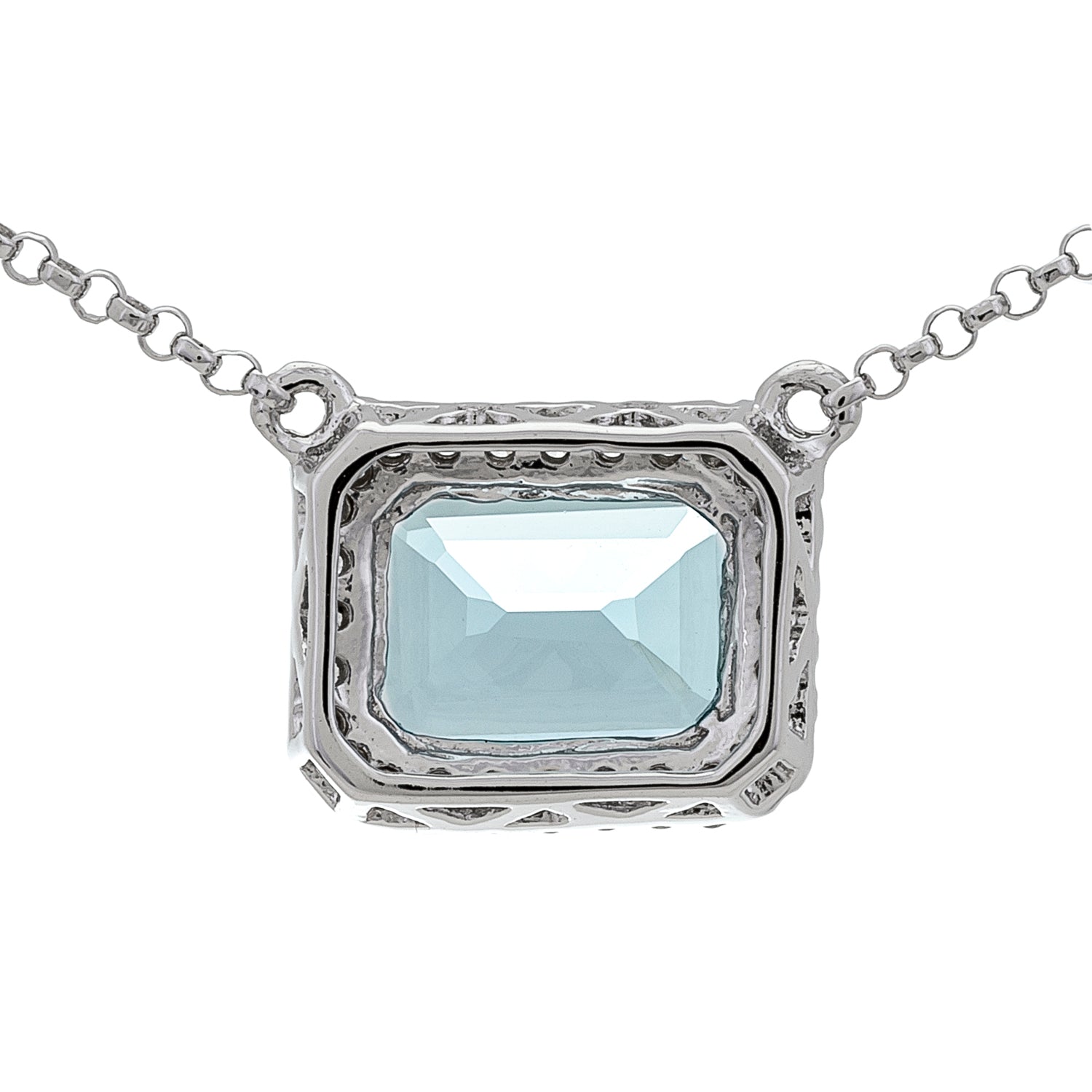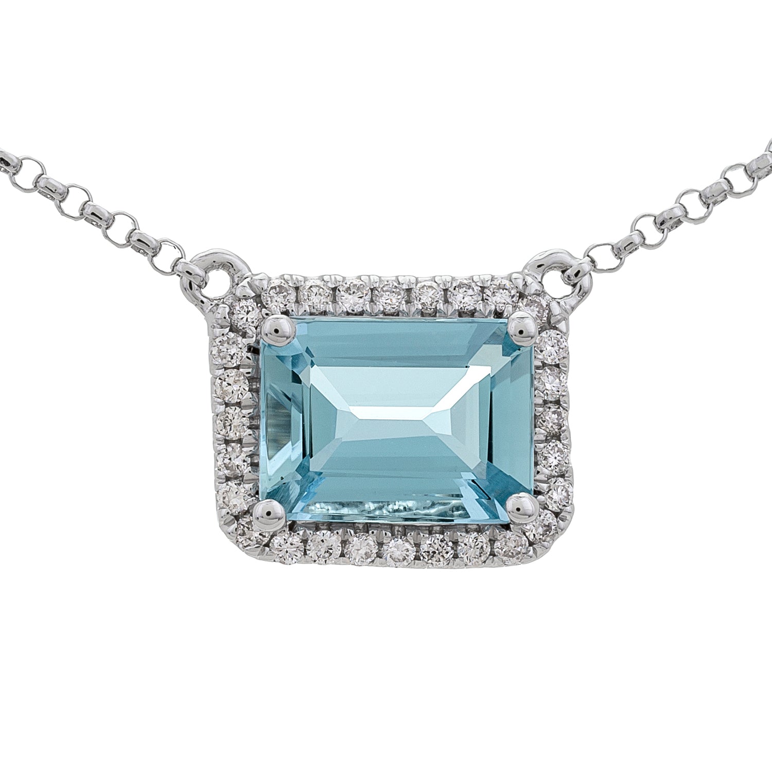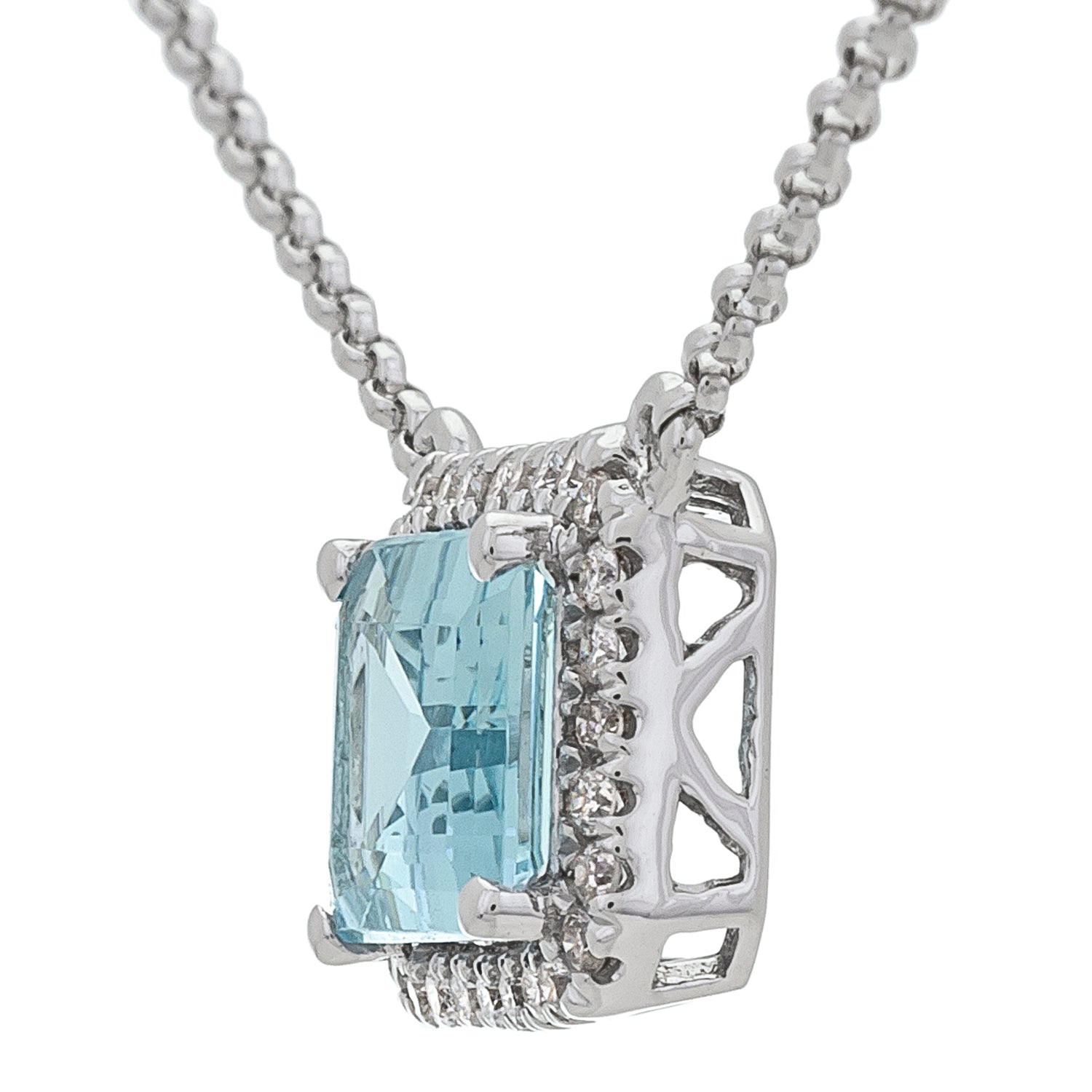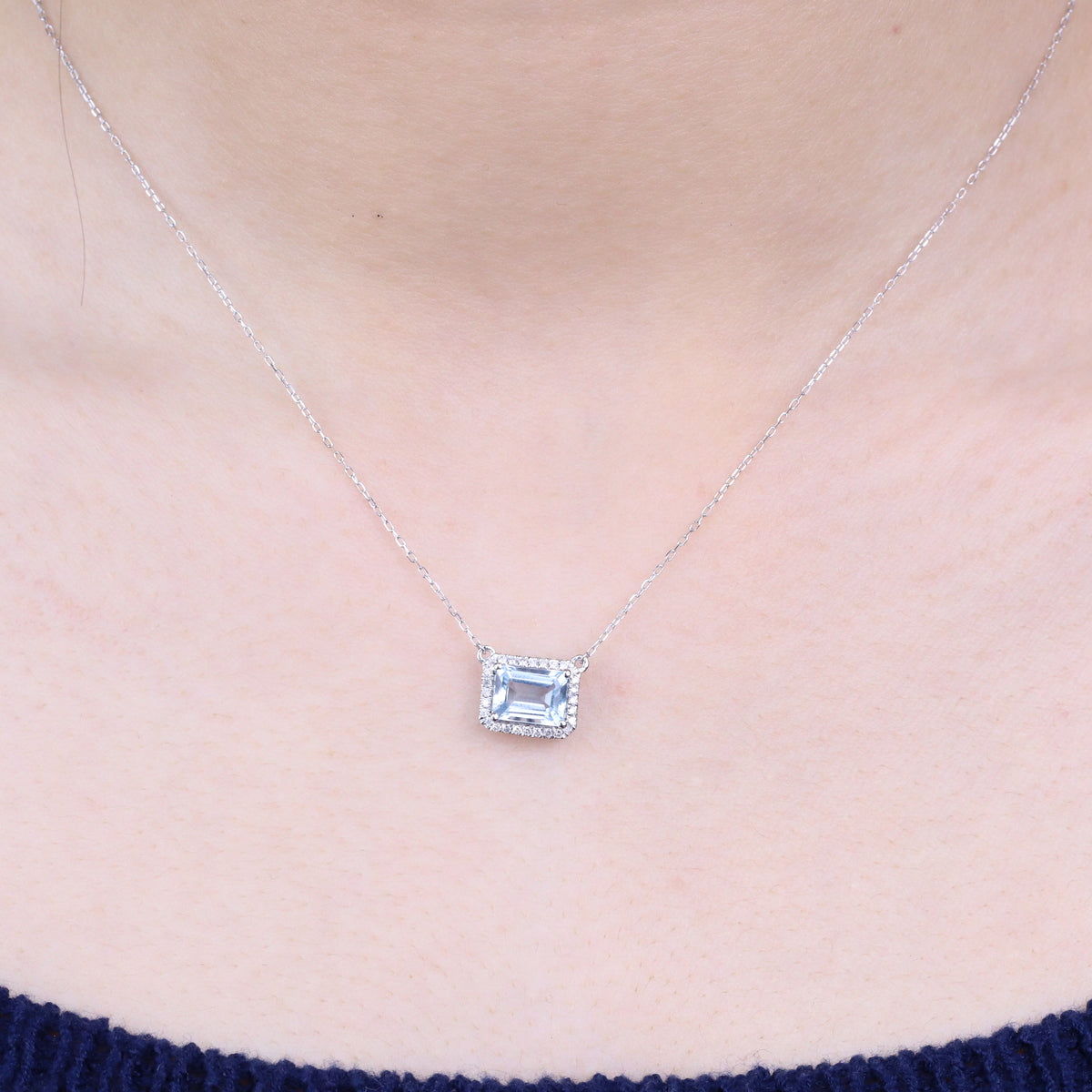 Decorate yourself in elegance with this Pendant is crafted from 14-karat White Gold by Gin & Grace Pendant. This Pendant is made up of 6*8 mm Emerald-Cut Prong setting Brazilian Aquamarine (1 Pcs) 1.35 Carat and Round-Cut Prong setting White Diamond (28 Pcs) 0.14 Carat. This Pendant is weight 1.79 grams. The gorgeous Pendant hangs from a 18-inch wheat chain. This delicate Pendant is polished to a high finish shine.