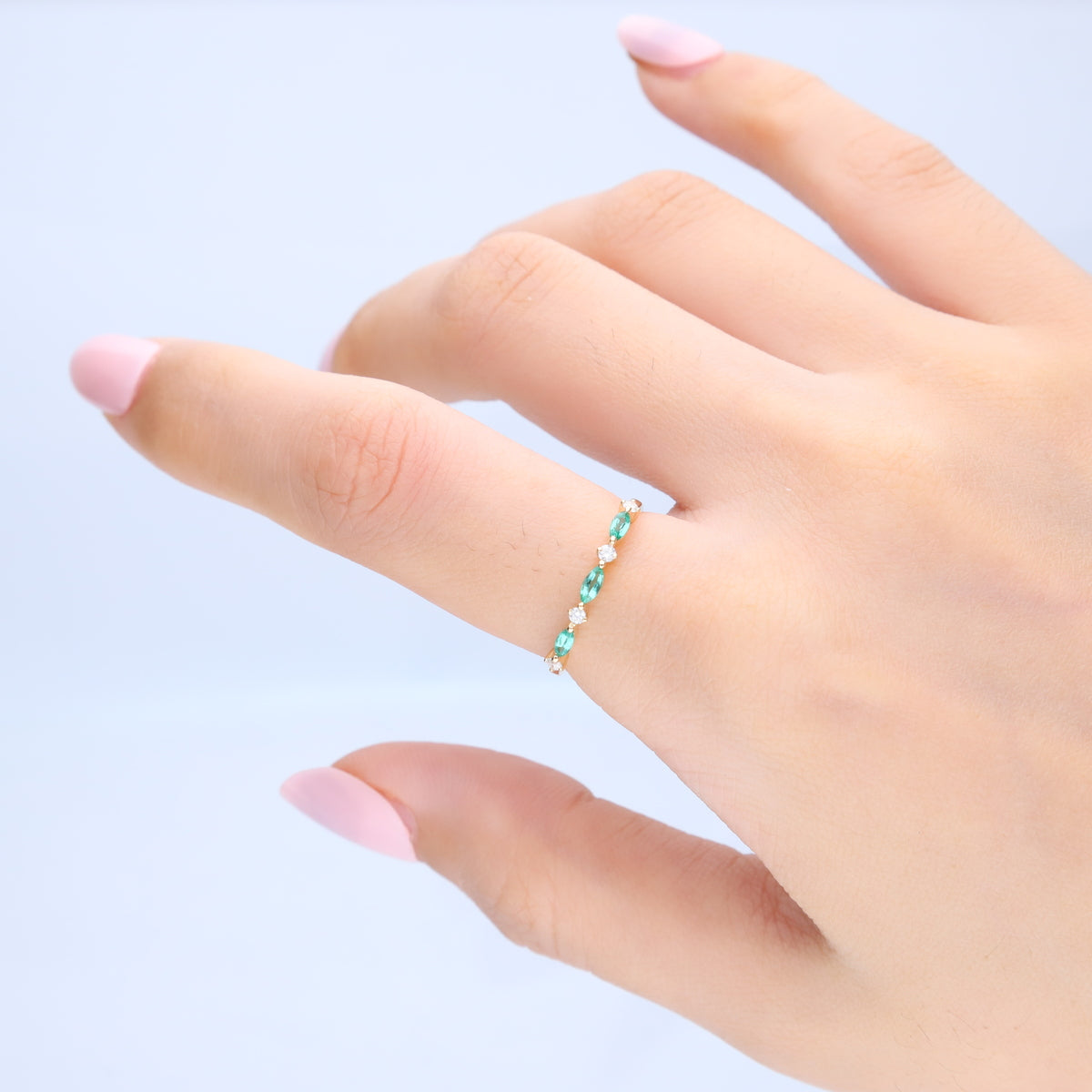 Elevate your style with the exquisite beauty of this Gin & Grace Ring, meticulously crafted from 14-karat Yellow Gold. This captivating piece features a trio of 2x4 mm Marquise-Cut Zambian Emerald gemstones, totaling 0.20 carats, and is accentuated by the brilliance of four Round-cut White Diamonds, weighing 0.07 carats.