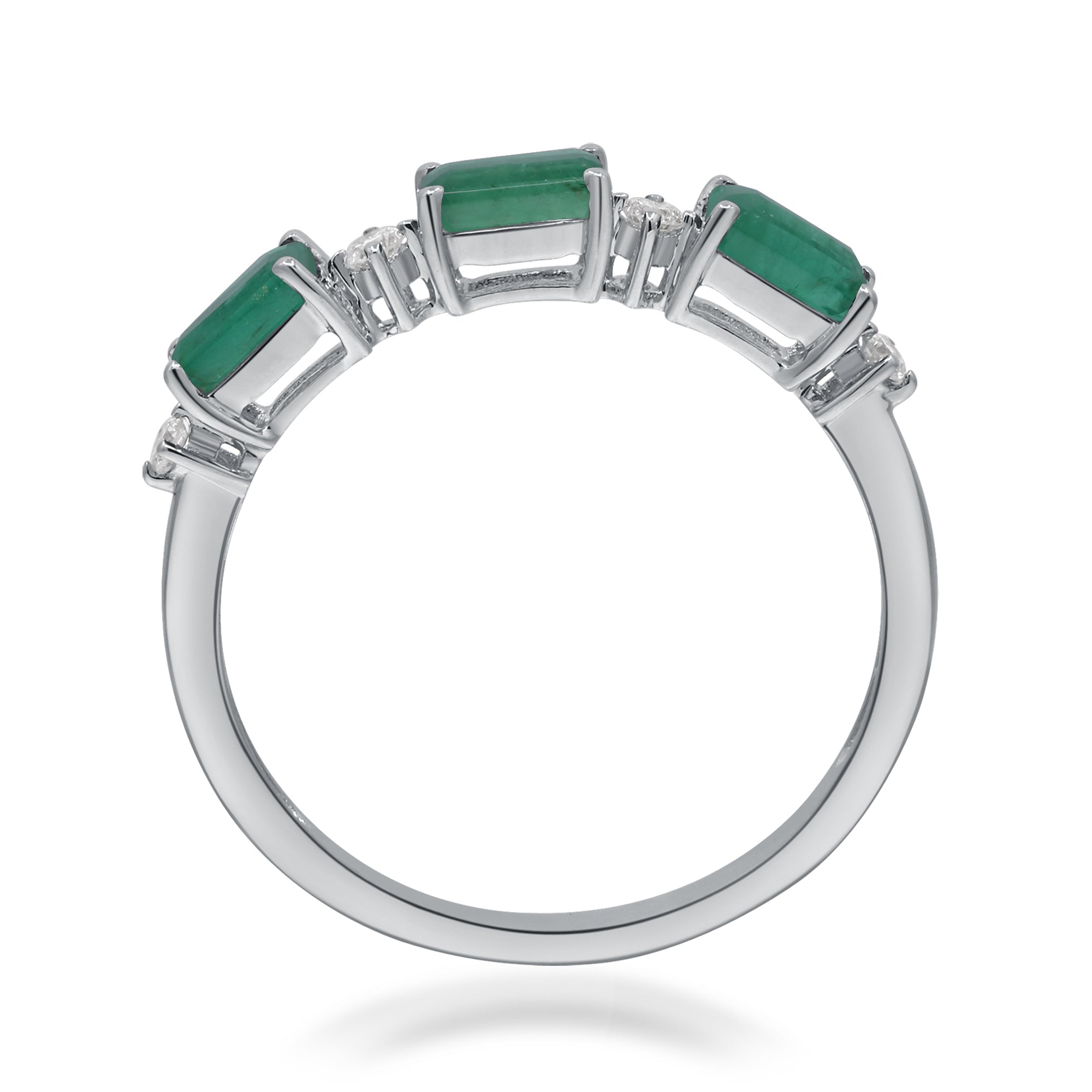 Decorate yourself in elegance with this Ring is crafted from 14-karat White Gold by Gin & Grace. This Ring is made up of emerald-cut Emerald (3 pcs) 0.88 carat and Round-cut White Diamond (4 pcs) 0.08 carat. This Ring is weight 1.71 grams. This delicate Ring is polished to a high finish shine.