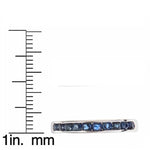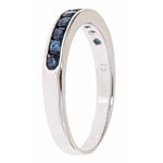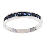 Along the front of this fashion ring, round-cut Genuine Ceylon Blue sapphires shine in a blue color. This piece of jewelry is crafted of 10-karat white gold with a high polish finish. Gemstone colors: Blue Gemstone shapes: Round 10 bezel-set round-cut sapphire stones each measure 1 mm Total gemstone weight: 3/5 carats Metal: 10k white gold Finish: High polish Metal weight: 1.83 grams Ring setting dimensions: 19 mm wide x 3 mm long Band dimensions: 2 mm