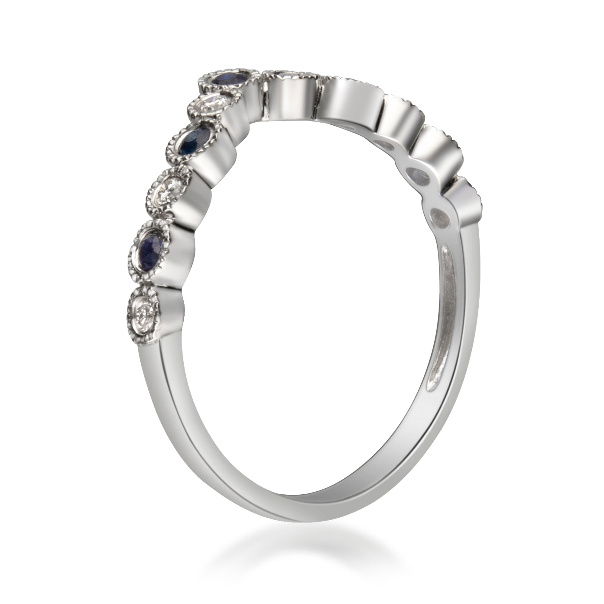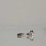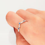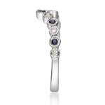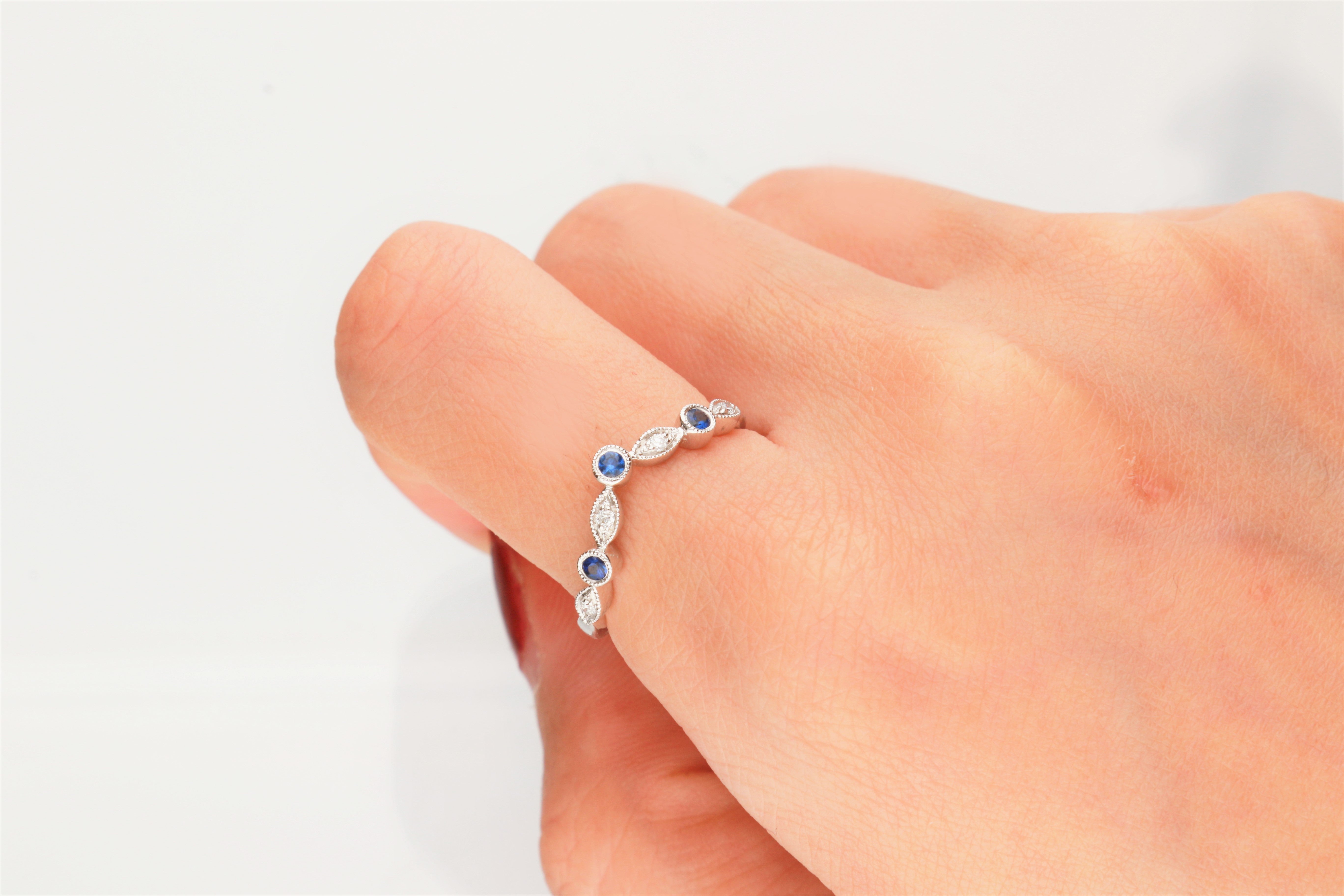 Stunning, timeless and classy eternity Engagement ring. Decorate yourself in luxury with this Gin & Grace ring. This ring is made up of Round-Cut Prong Setting Genuine Ceylon Blue Sapphire (3 pcs) 0.14 Carat and Round-Cut Prong Setting Diamond (4 pcs) 0.05 Carat accent stones for a lovely design. This ring is weight 2.07 grams. The ring is crafted of shining 14-karat White Gold and is completed by a highly polished finish.