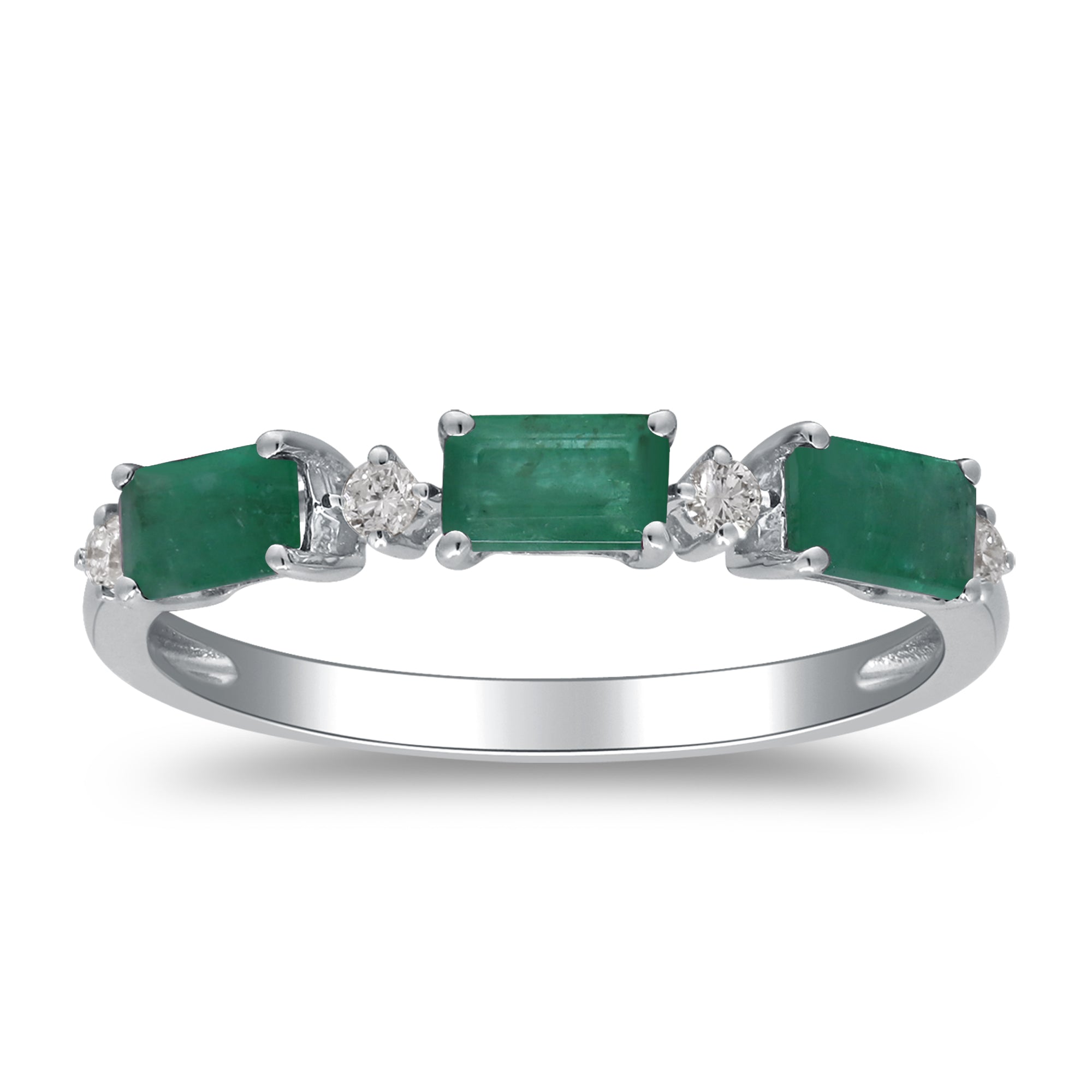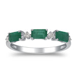 Decorate yourself in elegance with this Ring is crafted from 14-karat White Gold by Gin & Grace. This Ring is made up of emerald-cut Emerald (3 pcs) 0.88 carat and Round-cut White Diamond (4 pcs) 0.08 carat. This Ring is weight 1.71 grams. This delicate Ring is polished to a high finish shine.