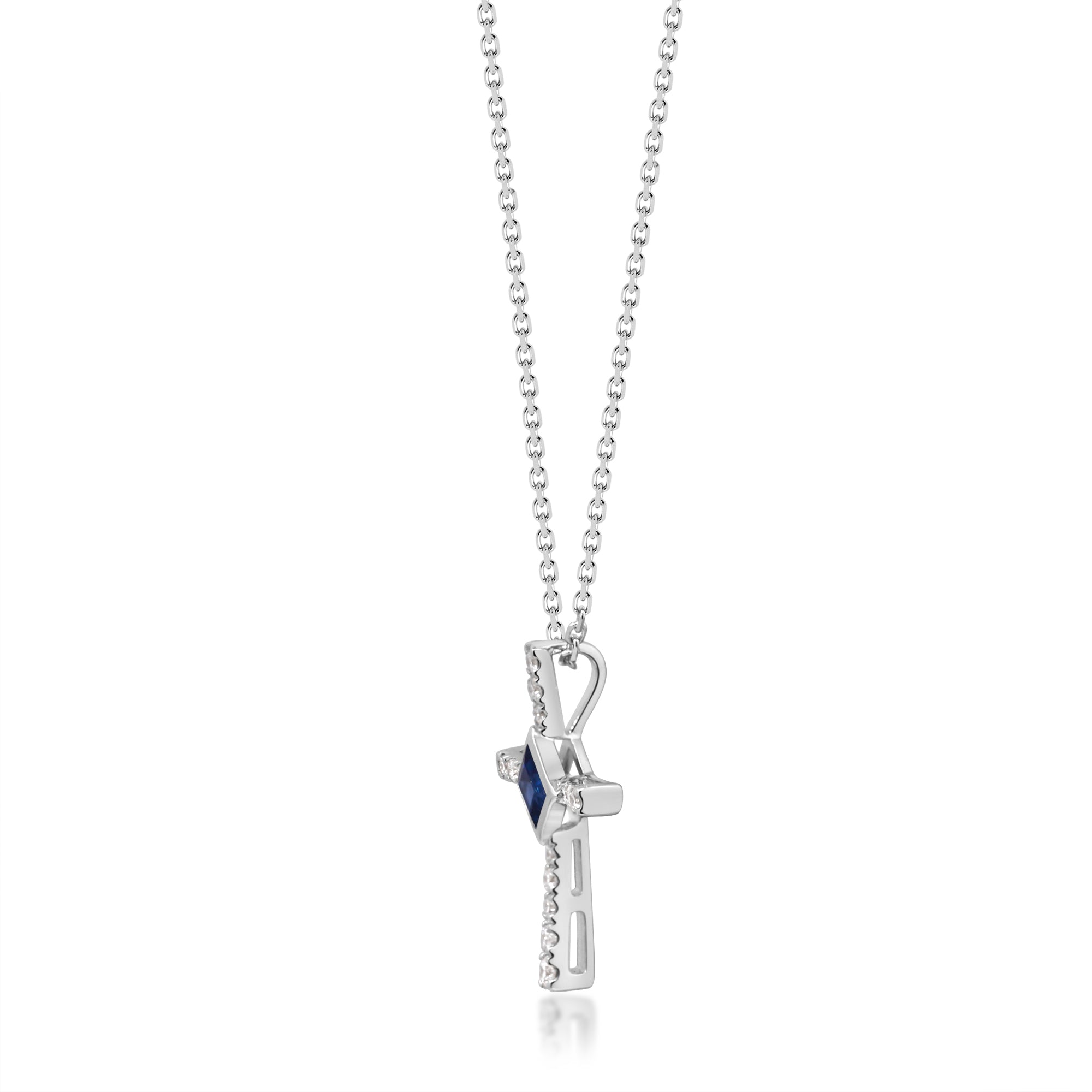 Decorate yourself in elegance with this Pendant is crafted from 14-karat White Gold by Gin & Grace Pendant. This Pendant is made up of 3.0mm square-cut Prong setting Ceylon Blue Sapphire (1 Pcs) 0.26 Carat and Round-Cut Prong setting White Diamond (14 Pcs) 0.10 Carat. This Pendant is weight 0.63 grams and 1.47 grams. The gorgeous Pendant hangs from an 18-inch wheat chain. This delicate Pendant is polished to a high finish shine.