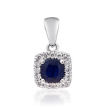 Decorate yourself in elegance with this Pendant is crafted from 10-karat White Gold by Gin & Grace. This Pendant is made up of Cushion-Cut Blue Sapphire (1 pcs) 0.70 carat and Round-cut White Diamond (16 Pcs) 0.11 Carat. This Pendant is weight 0.69 grams. This delicate Pendant is polished to a high finish shine.