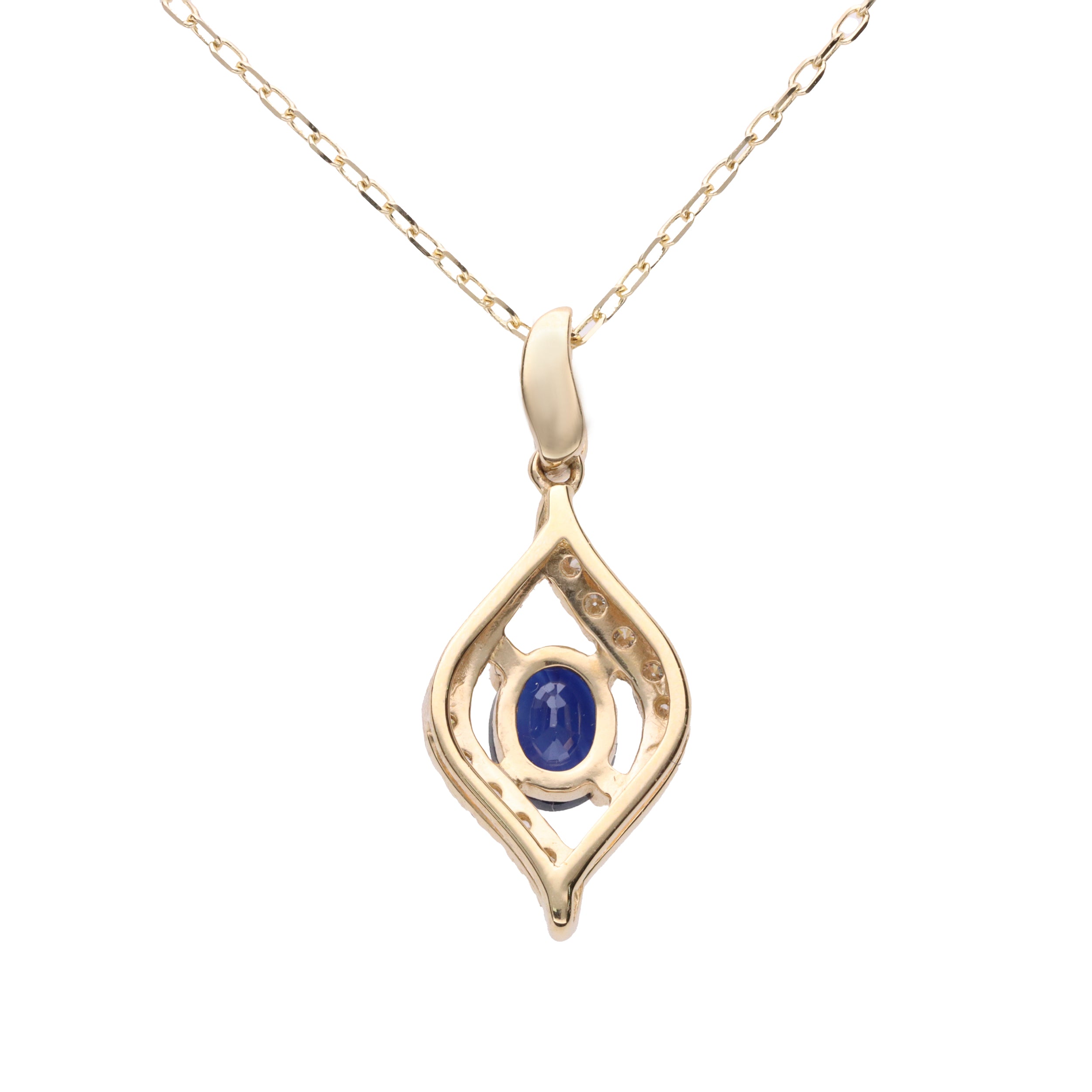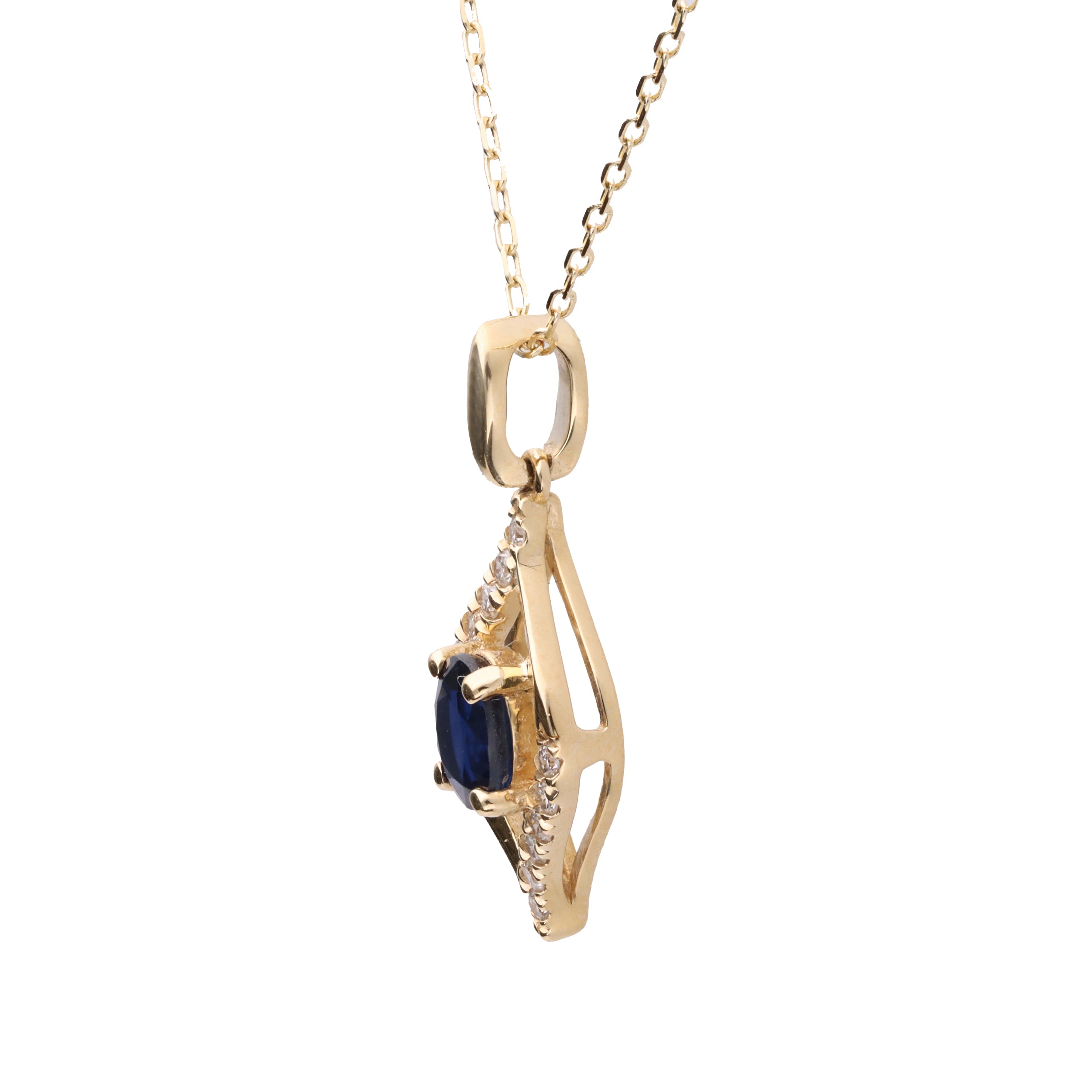 Decorate yourself in elegance with this Pendant crafted from 14K Yellow Gold by Gin & Grace. This Pendant is made up of Ceylon Blue Sapphire Oval-cut (1 pcs) 0.45 and Round-cut White Diamond (12 Pcs) 0.10 Carat. This Pendant weigh 1.71 grams. This delicate Pendant is polished to a high finish shine.
