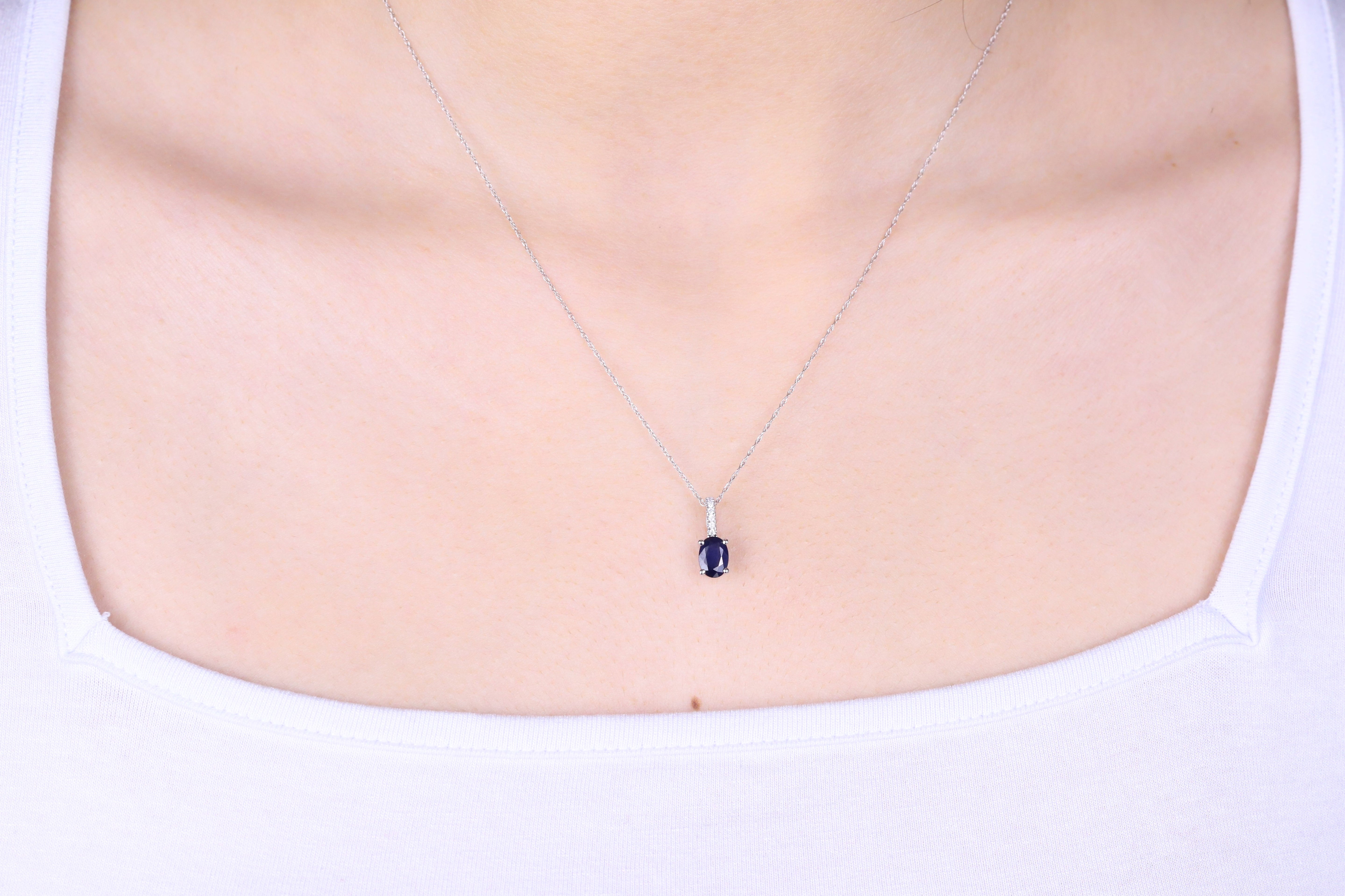 Decorate yourself in elegance with this Pendant is crafted from 10-karat White Gold by Gin & Grace. This Pendant is made up of 5*7 mm Oval Ceylon Blue sapphire (1 pcs) 0.90 carat and Round-cut White Diamond (6 Pcs) 0.04 Carat. This Pendant is weight 0.78 grams. This delicate Pendant is polished to a high finish shine.
