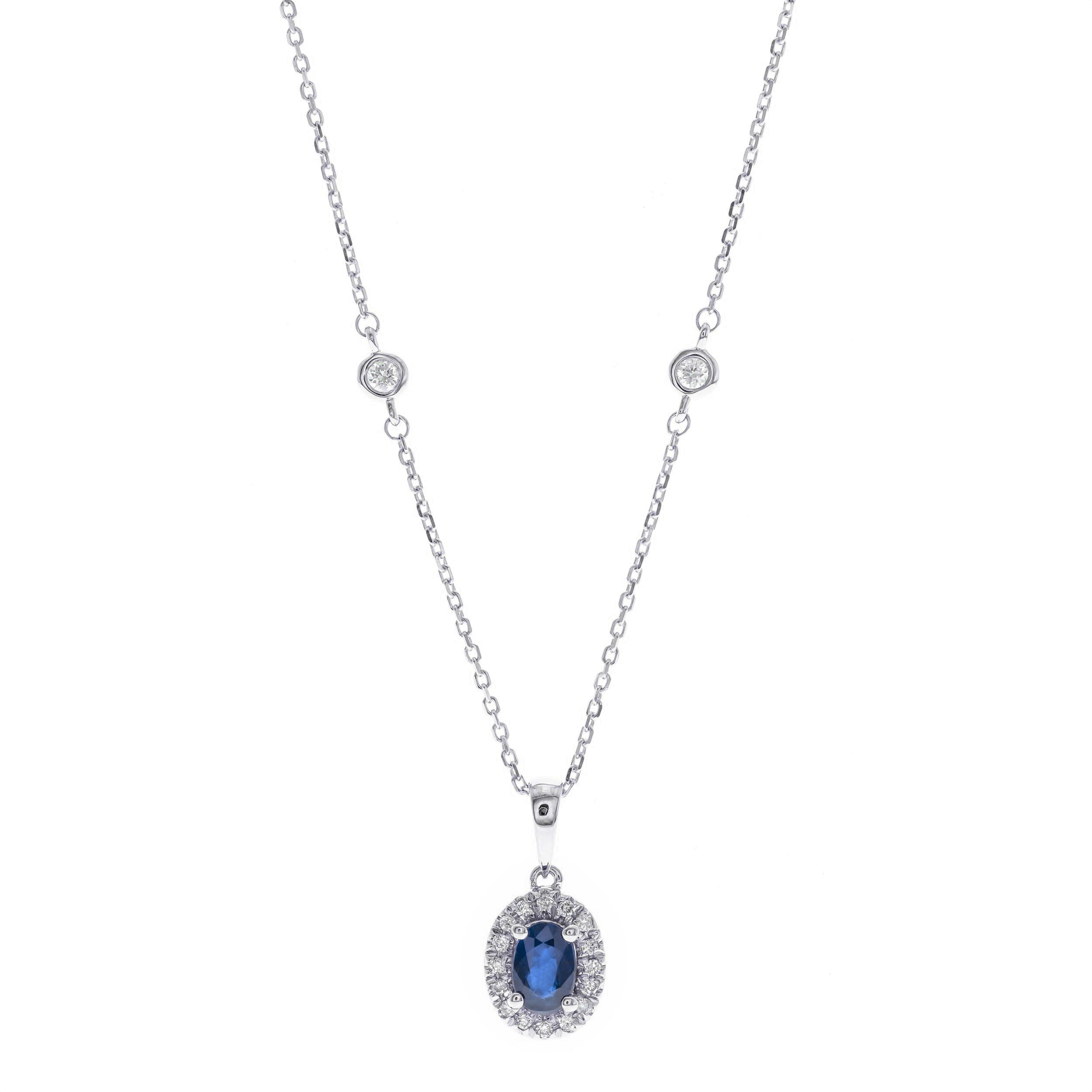 Decorate yourself in elegance with this Pendant is crafted from 10-karat White Gold by Gin & Grace Pendant. This Pendant is made up of Oval-Cut Prong setting Ceylon Blue Sapphire (1 Pcs) 0.58 Carat and Round-Cut Prong setting White Diamond (16 Pcs) 0.10 Carat. This Pendant is weight 1.27 grams. The gorgeous Pendant hangs from an 18-inch wheat chain. This delicate Pendant is polished to a high finish shine.