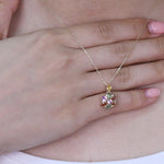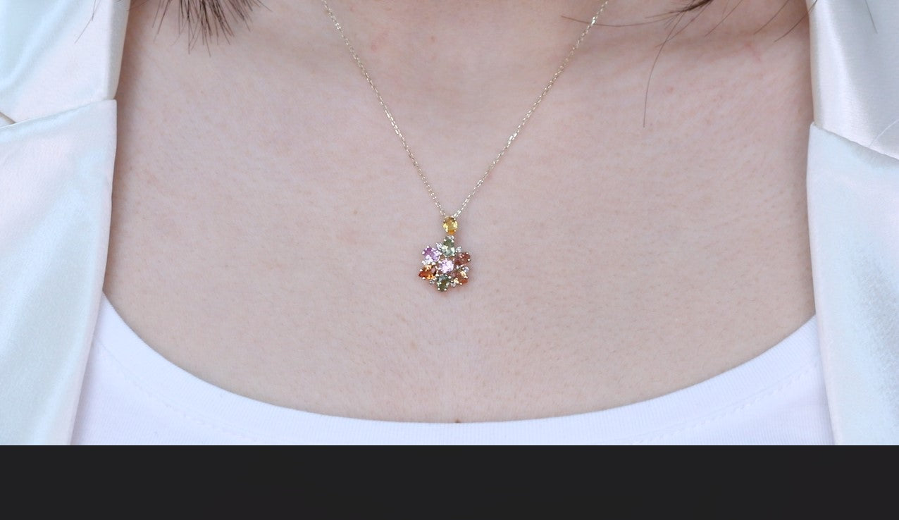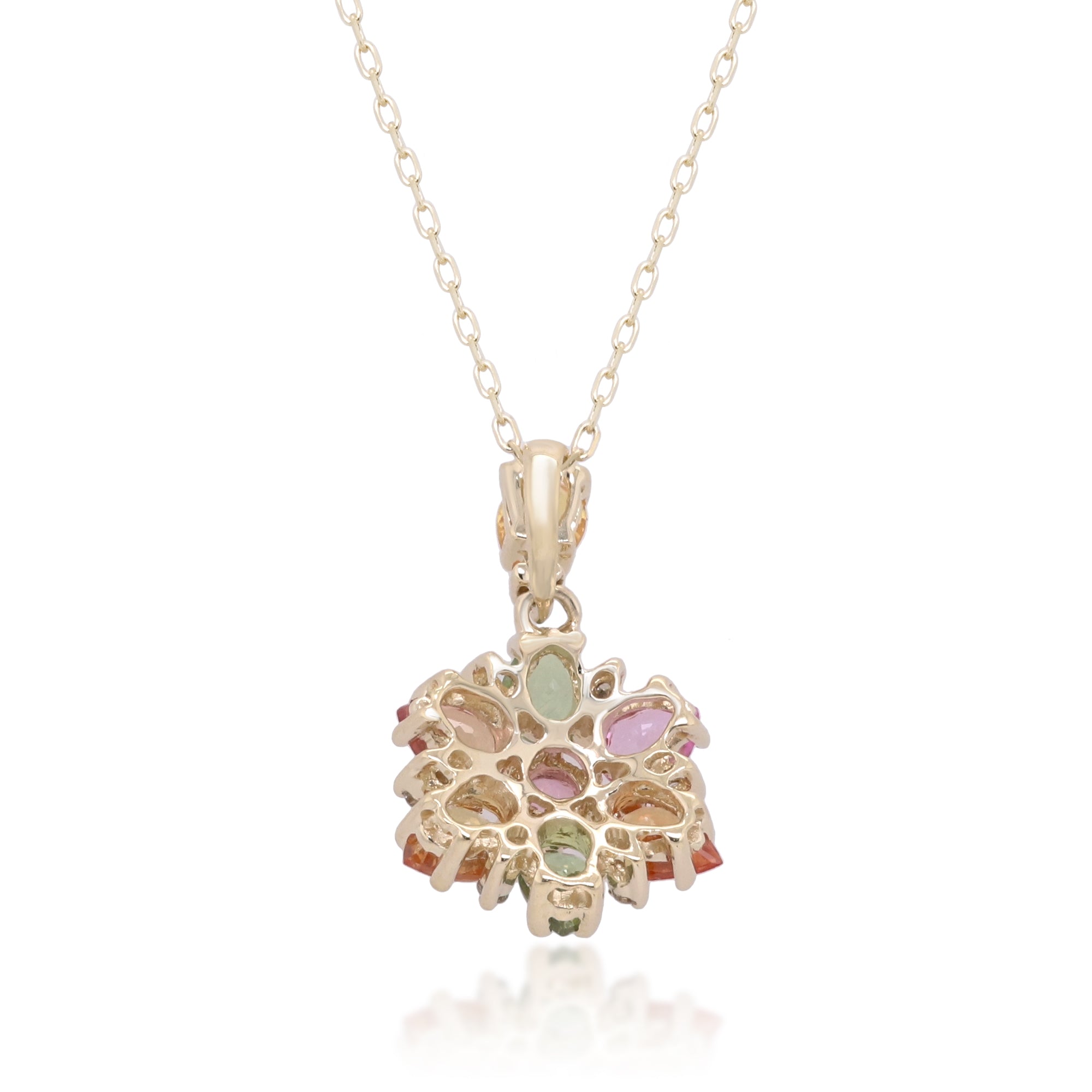 Decorate yourself in elegance with this Pendant is crafted from 10K Yellow Gold by Gin & Grace. This Pendant is made up of 3*4 mm Pear-Cut Multi Sapphire (7 Pcs) 1.30 carat and 3.0 Round-cut Pink Sapphire (1 Pc) 0.15 and Round-Cut Diamond (7 Pcs) 0.05 Carat. This Pendant is weight 1.82 grams. This delicate Pendant is polished to a high finish shine.