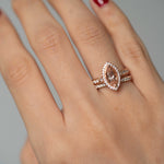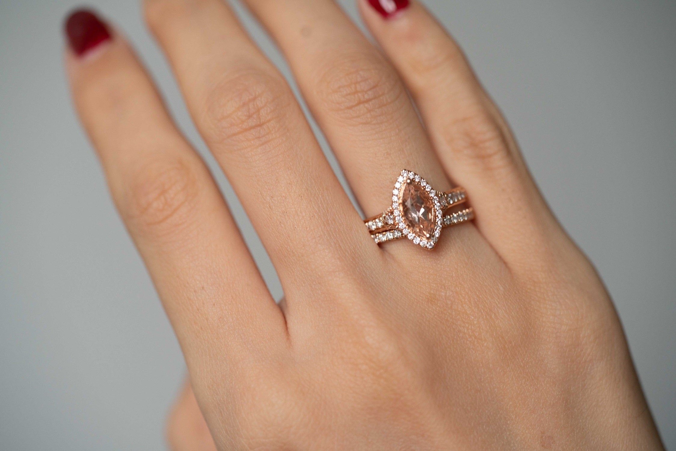 Stunning, timeless and classy eternity engagement ring. Decorate yourself in luxury with this Gin & Grace ring. The 14k Rose Gold jewelry boasts 5X10 Marquise-Cut Prong Setting Genuine Madagascar Morganite (1pcs) 0.93 Carat, and Round-Cut Prong Setting Diamond (59 pcs) 0.55 Carat accent stones for a lovely design. This ring is weight 3.81 grams. Crafted with 14k Rose Gold, this delicate Ring is polished to a high finish shine.