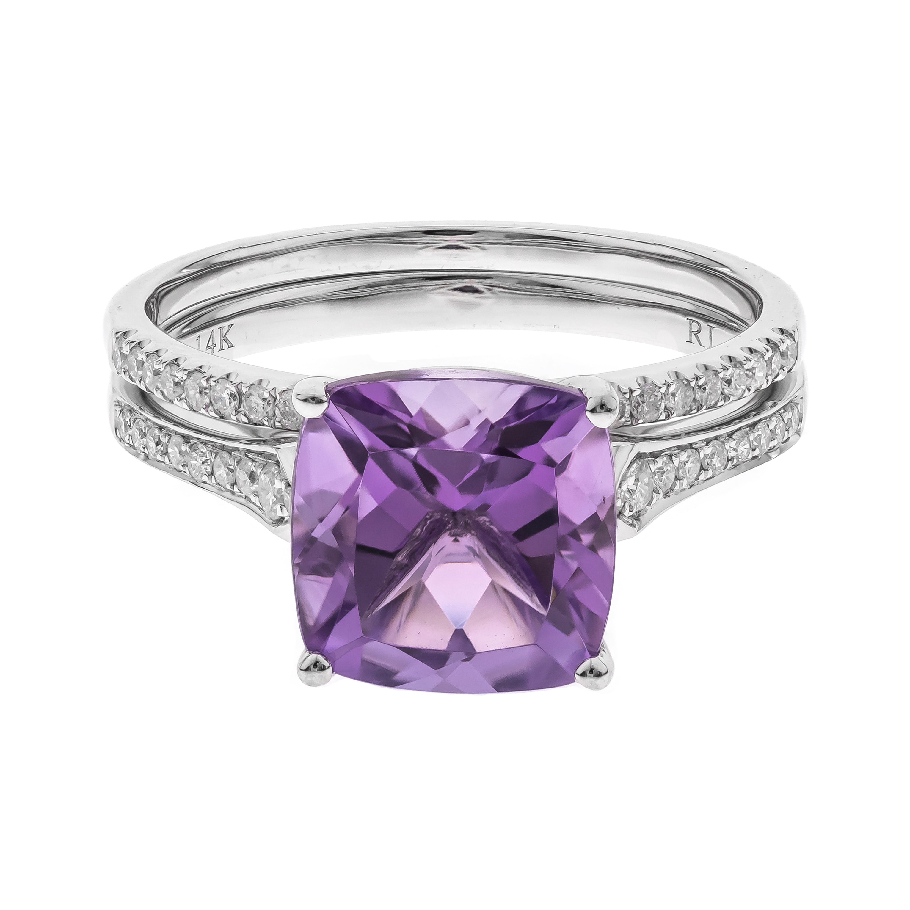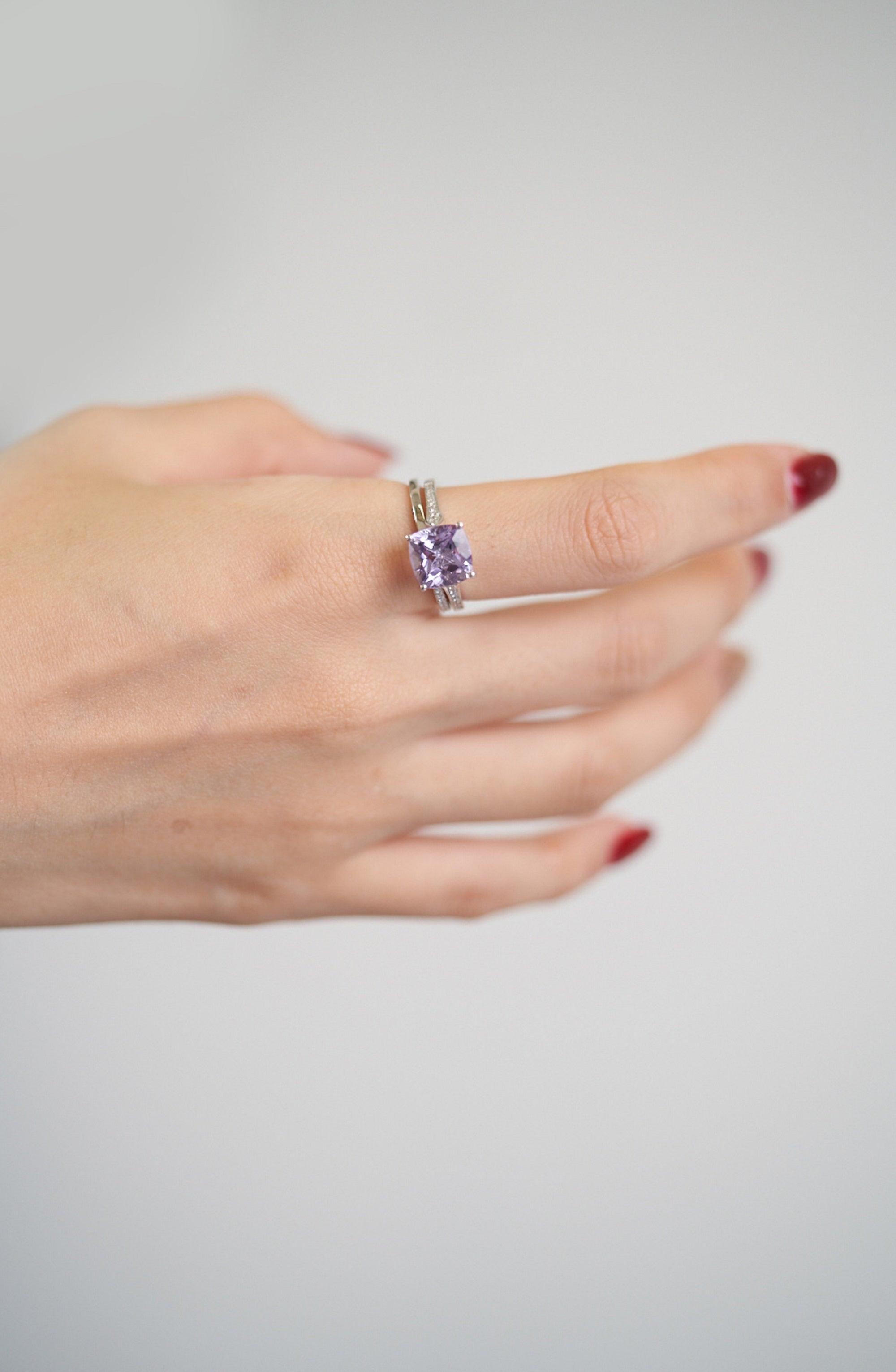 Stunning, timeless and classy eternity Engagement ring. Decorate yourself in luxury with this Gin & Grace ring. This ring is made up of Cushion-Cut Prong Setting Genuine Light Brazilian Pink Amethyst (1pcs) 2.93 Carat and Round-Cut Prong Setting Natural Diamond (41 pcs) 0.22 Carat accent stones for a lovely design. This ring is weight 3.58 grams. The ring is crafted of shining 14-karat White Gold and is completed by a highly polished finish.