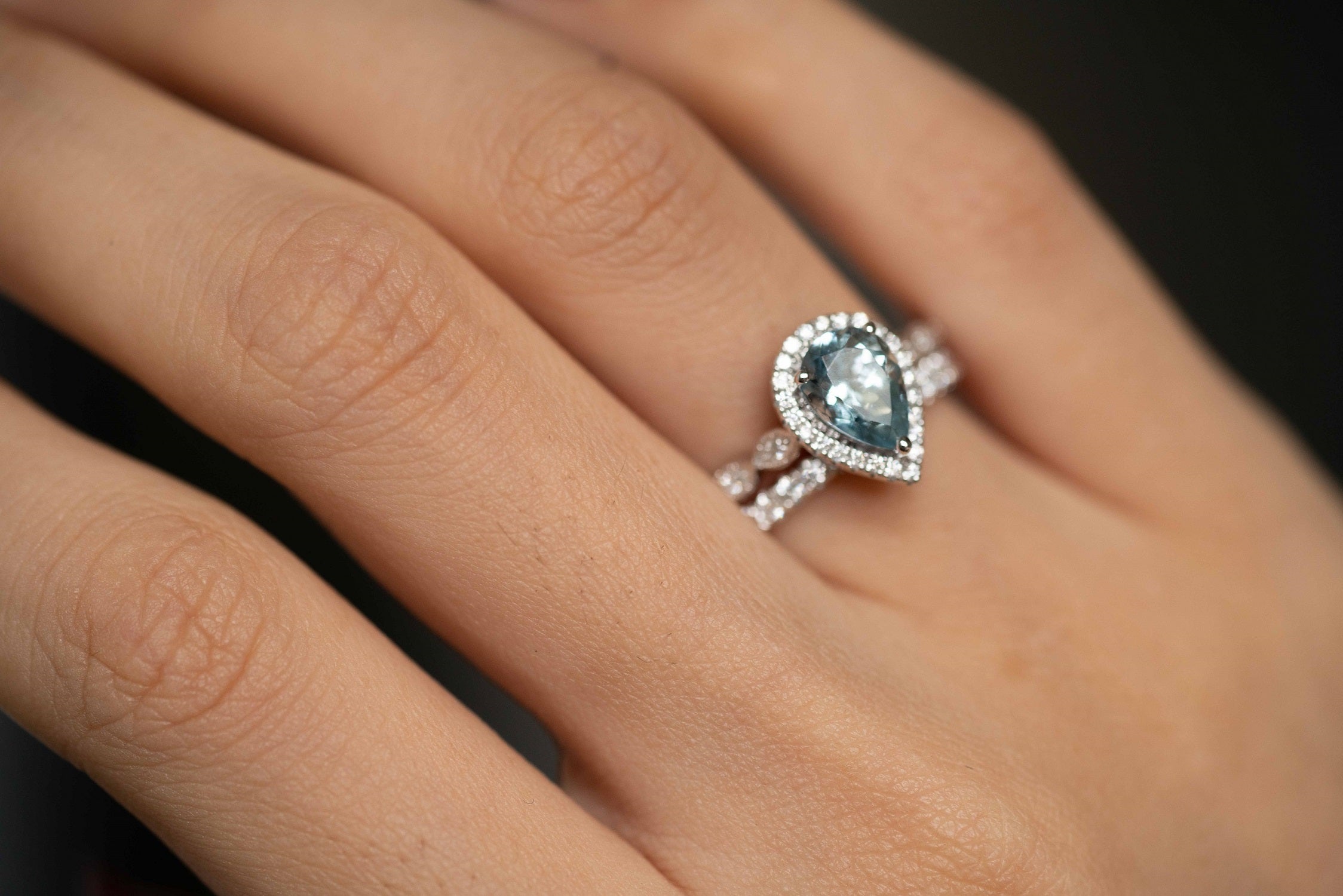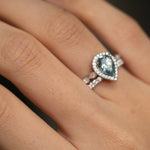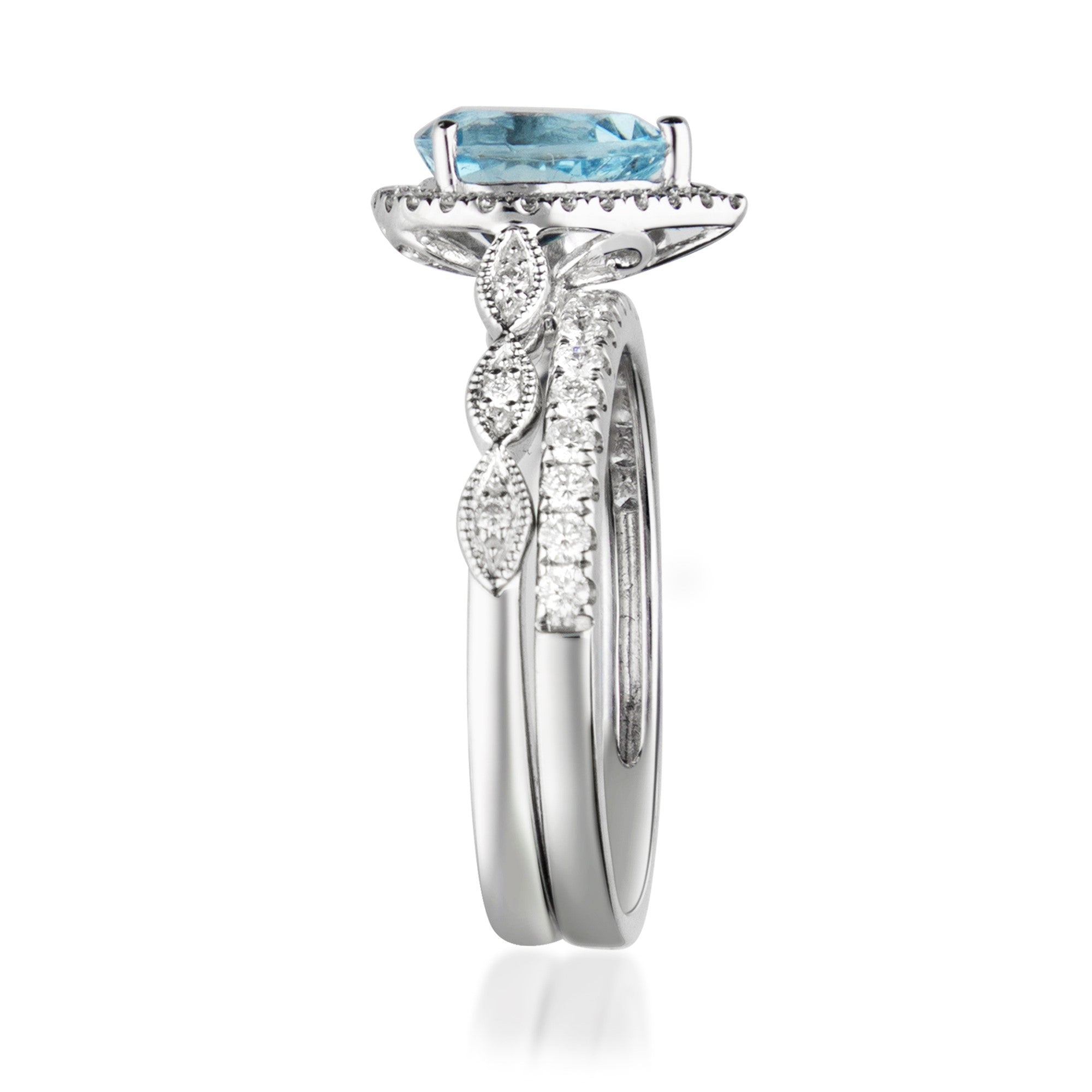 Stunning, timeless and classy eternity Engagement ring. Decorate yourself in luxury with this Gin & Grace ring. This ring is made up of Pear-Cut Prong Setting Genuine Brazilian Aquamarine (1 pcs) 0.90 Carat and Round-Cut Prong Setting Diamond (49 pcs) 0.40 Carat accent stones for a lovely design. This ring is weight 3.90Â grams. The ring is crafted of shining 14-karat White Gold and is completed by a highly polished finish.