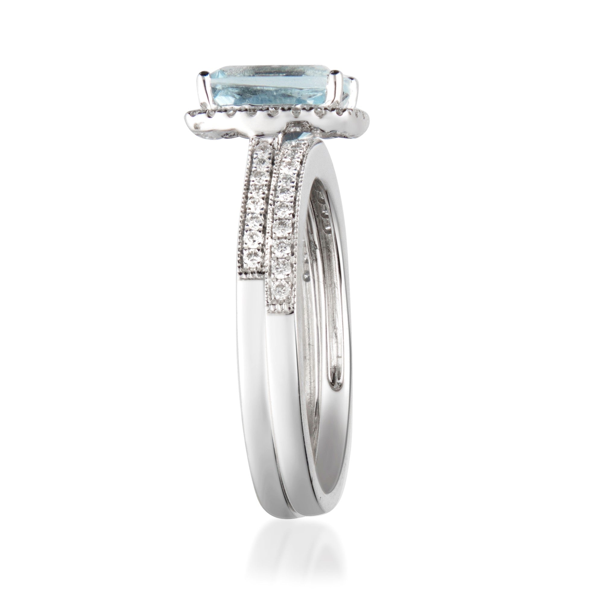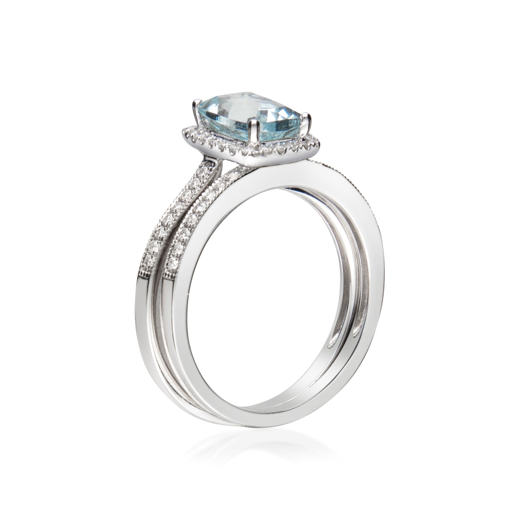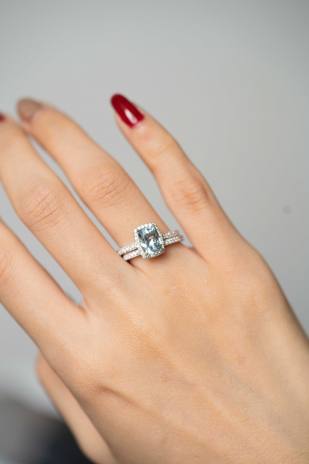 Stunning, timeless and classy eternity Engagement ring. Decorate yourself in luxury with this Gin & Grace ring. This ring is made up of 6X8 Cushion Prong Setting Genuine Brazilian Aquamarine (1 pcs) 1.06 Carat and Round-Cut Prong Setting Natural Diamond (61 pcs) 0.29 Carat accent stones for a lovely design. This ring is weight 3.84 grams. The ring is crafted of shining 14-karat White Gold and is completed by a highly polished finish.