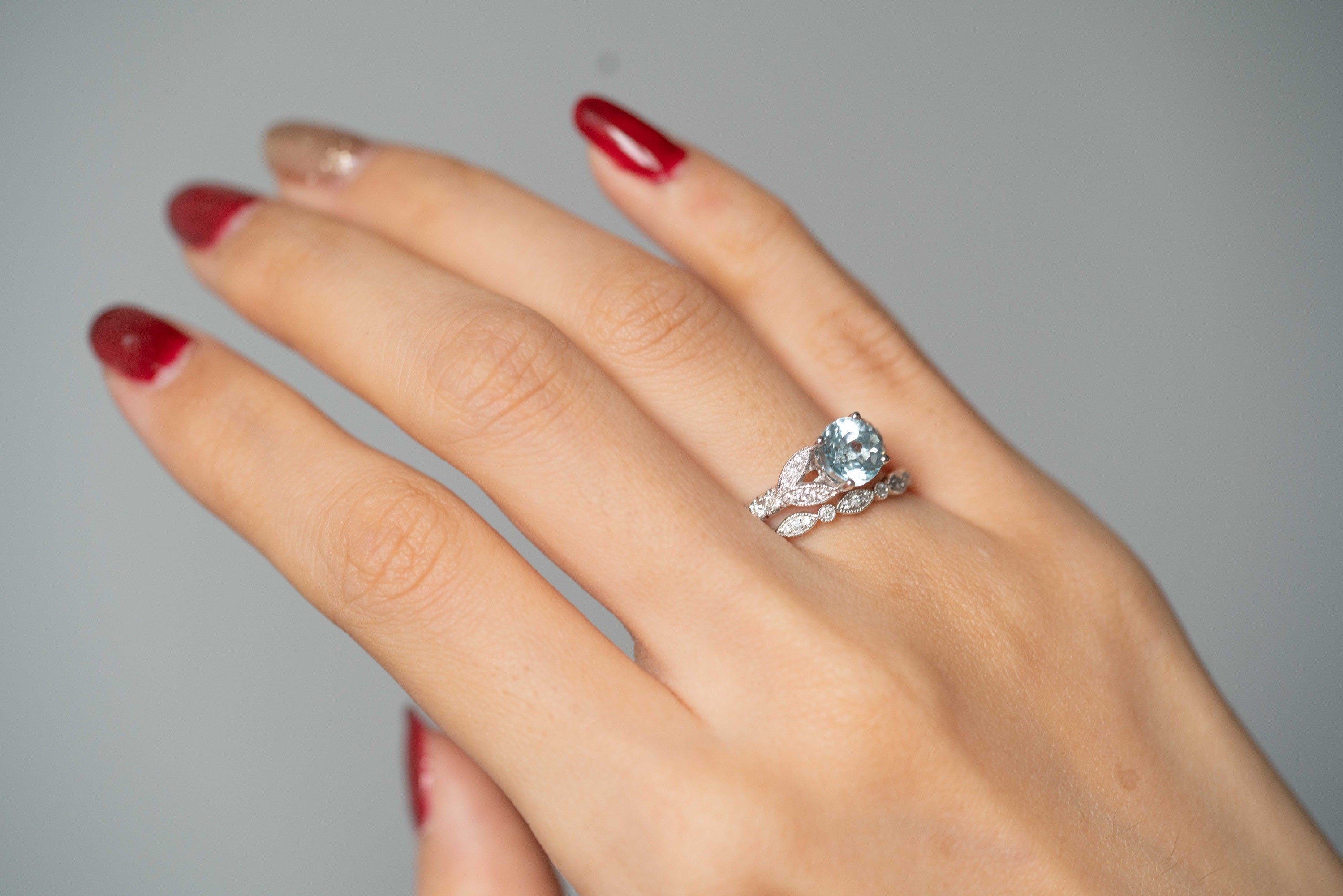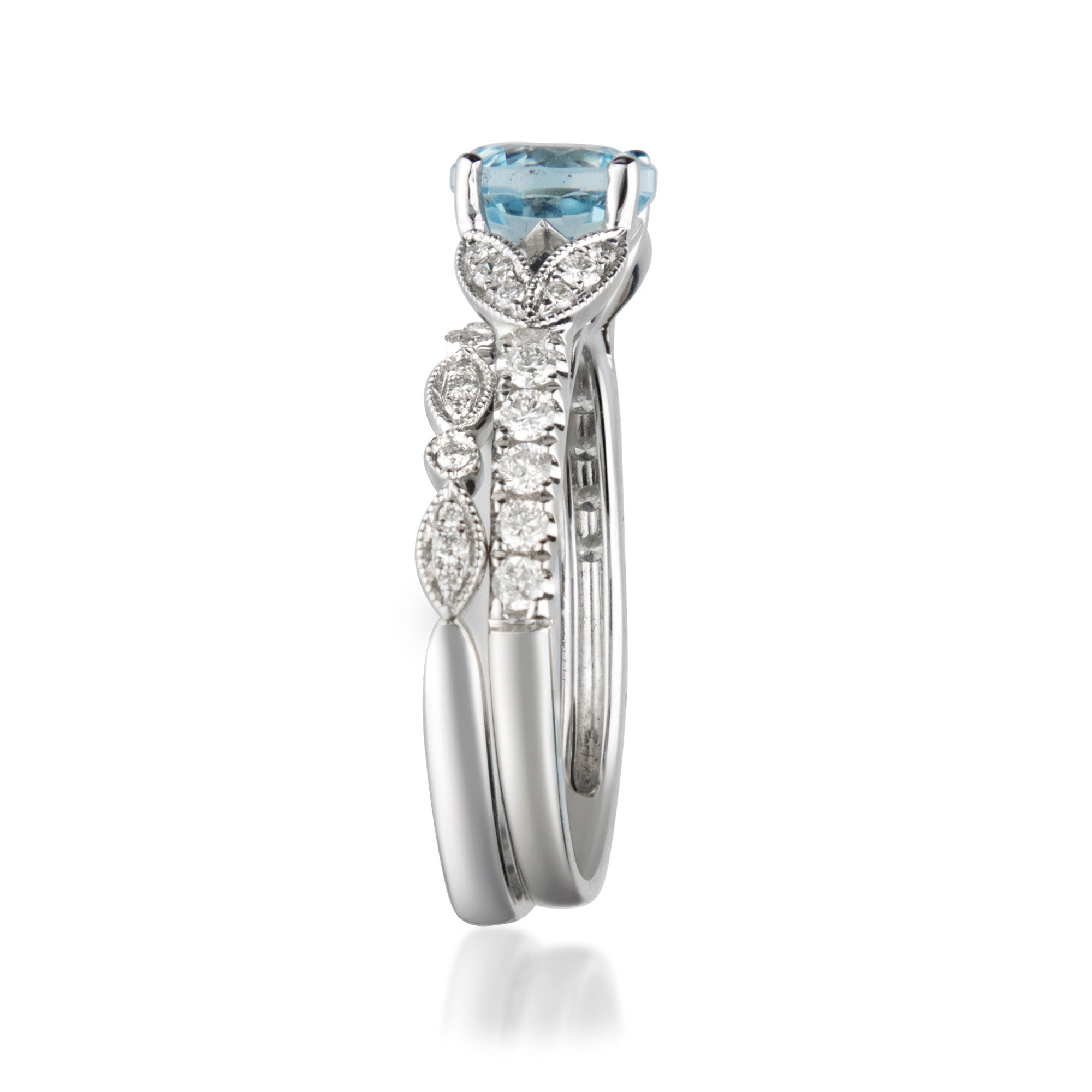 Stunning, timeless and classy eternity Engagement ring. Decorate yourself in luxury with this Gin & Grace ring. This ring is made up of Round-Cut Prong Setting Genuine Brazilian Aquamarine (1pcs) 0.94 Carat and Round-Cut Prong Setting Diamond (41 pcs) 0.38Carat accent stones for a lovely design. This ring is weight 4.18 grams. The ring is crafted of shining 14-karat White Gold and is completed by a highly polished finish.